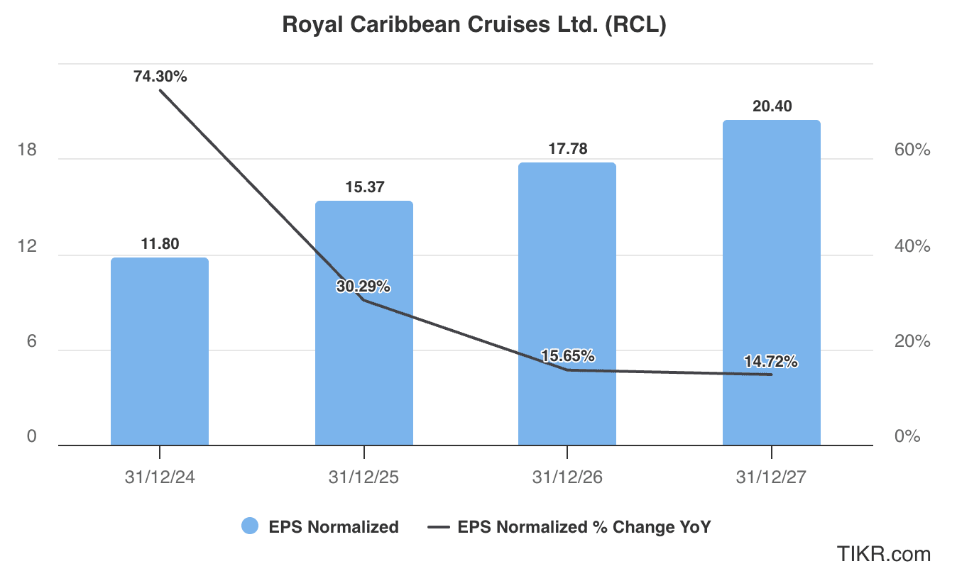 Analysts tracking RCL stock expect its sales to rise from $16.5 billion in 2024 to $21.4 billion in 2027. Comparatively, adjusted earnings are forecast to increase from $11.80 per share to $20.40 per share in this period.