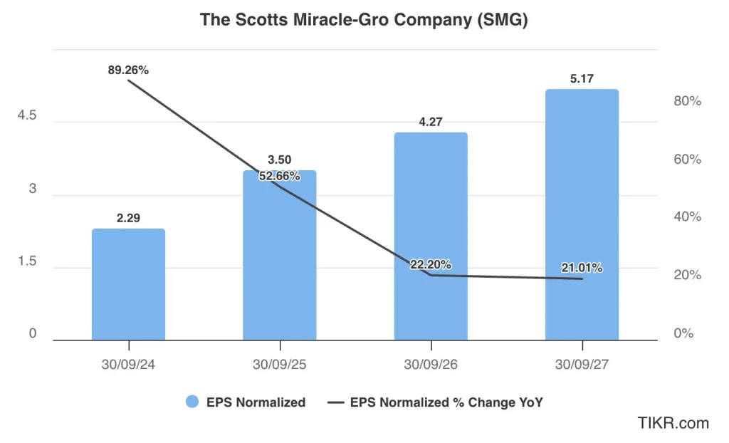 Analysts tracking SMG stock expect its sales to rise from $3.55 billion in fiscal 2024 to $3.58 billion in fiscal 2027, a relatively modest increase. Comparatively, adjusted earnings are forecast to expand from $2.29 per share to $5.17 per share in this period.