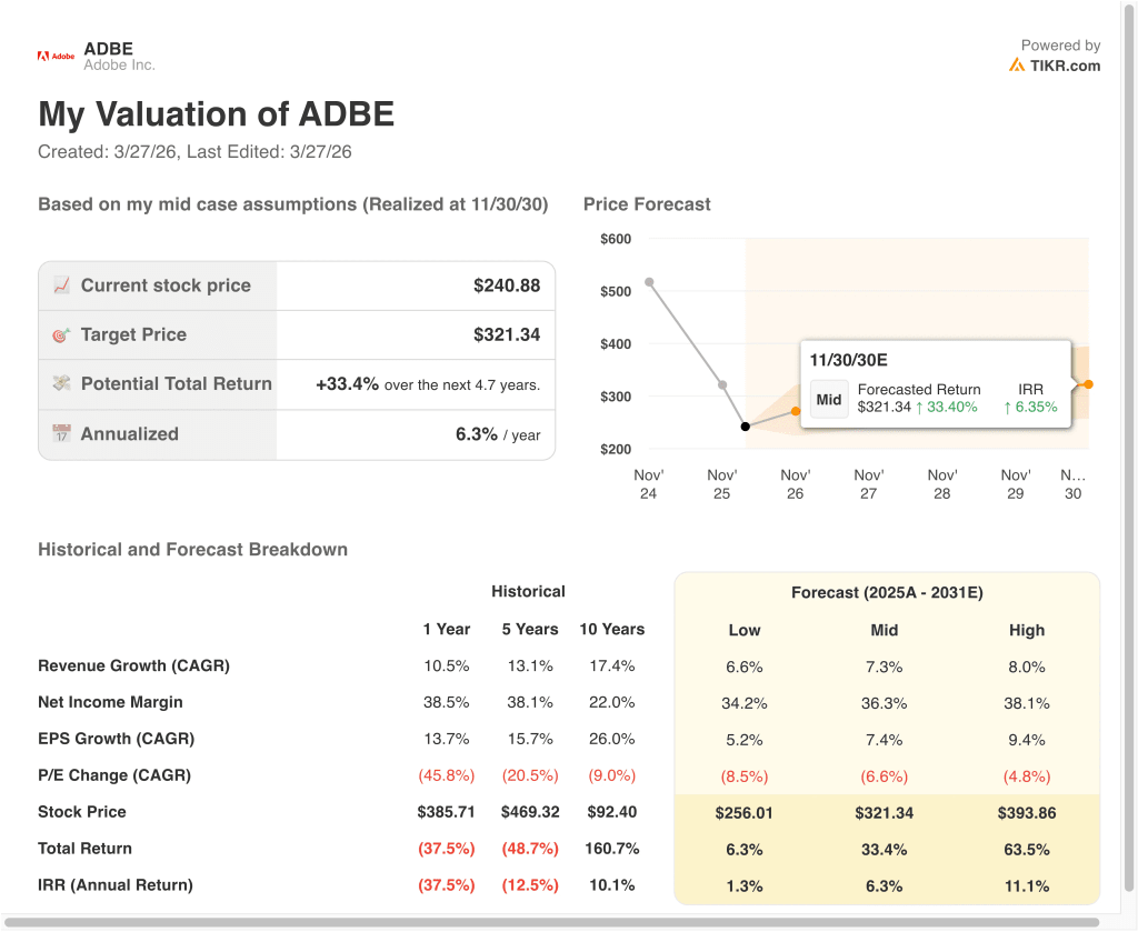 - Mid Case: Adobe keeps scaling AI across Creative Cloud, Document Cloud, and enterprise workflows → 6.3% annual returns