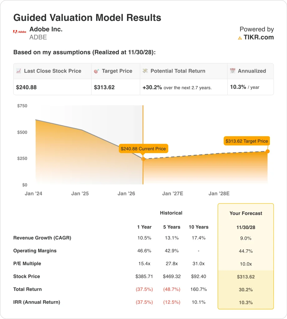 Based on estimates of 9.0% annual revenue growth, 44.7% operating margins, and a normalized P/E multiple of 10.0x, the model projects Adobe stock could rise from $241 to $314 per share.