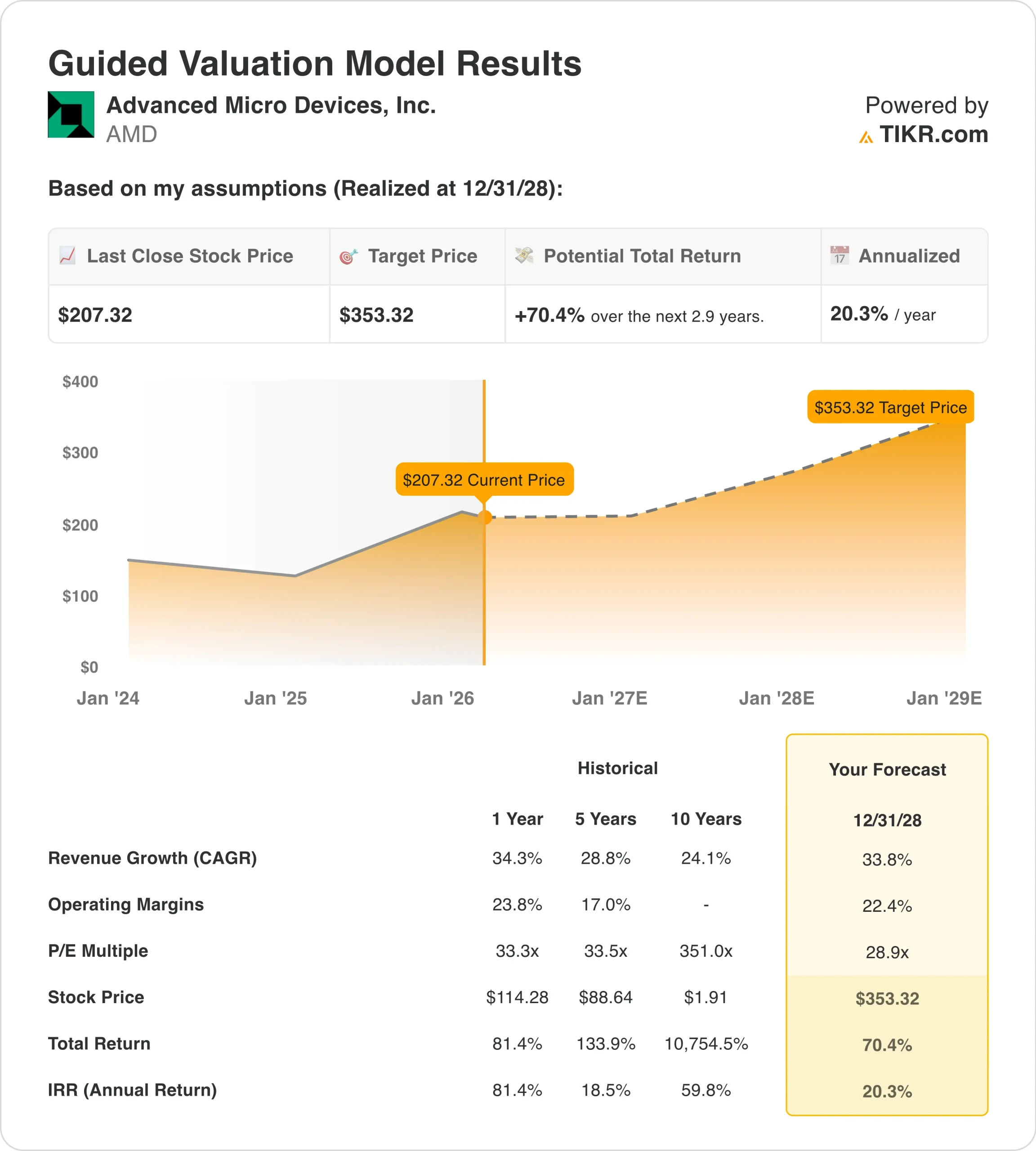 Based on these inputs, the model estimates a target price of $353.32, implying 70.4% total upside from the current share price of $207.32 and an 20.3% annualized return over the next 2.9 years.
