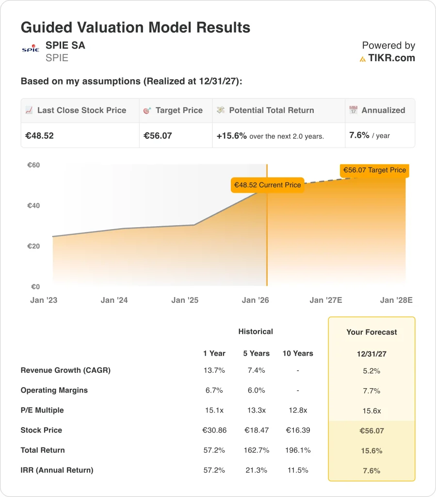 Based on estimates of 5.2% annual revenue growth, 7.7% net income margins, and a normalized exit P/E multiple of 15.6x, the model projects SPIE SA stock could rise from €46 to €56 per share in the next 2.0 years.