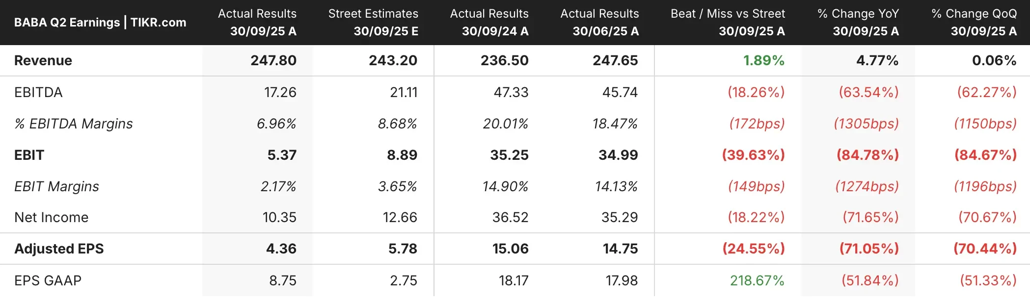Adjusted EBITA plunged 78% year-over-year to just RMB 9.1 billion, primarily due to heavy investments in quick commerce and AI infrastructure.