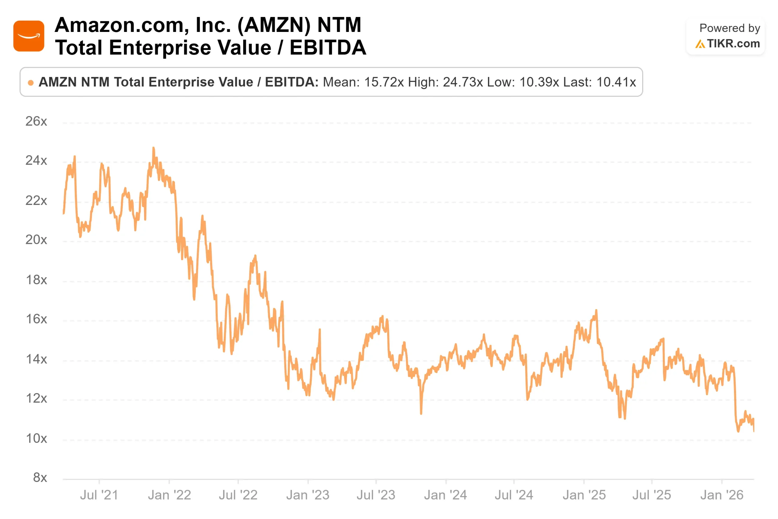 At $207.24, Amazon trades at 26.84x forward earnings and 10.83x NTM EV/EBITDA (next twelve months enterprise value divided by earnings before interest, taxes, depreciation, and amortization).