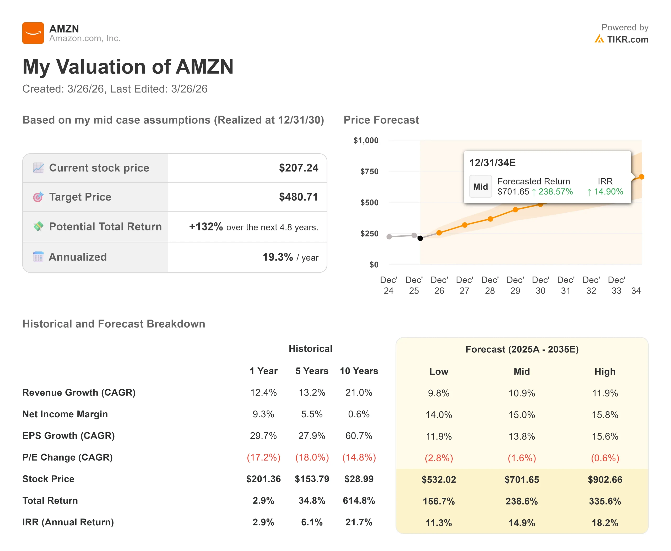 The TIKR mid-case model targets $480.71 by December 31, 2030, a 132% total return at a 19.30% annualized IRR from $207.24. The two revenue drivers are AWS re-acceleration as AI enterprise workloads scale into production and continued retail monetization through advertising and everyday essentials. The margin driver is net income margin expansion to 15.0% by 2030, up from 10.8% today, as the capex cycle matures and high-margin AWS and advertising revenue grow as a share of the mix. The primary risk is that AI monetization takes longer than expected, extending free cash flow suppression and pressuring the multiple further.