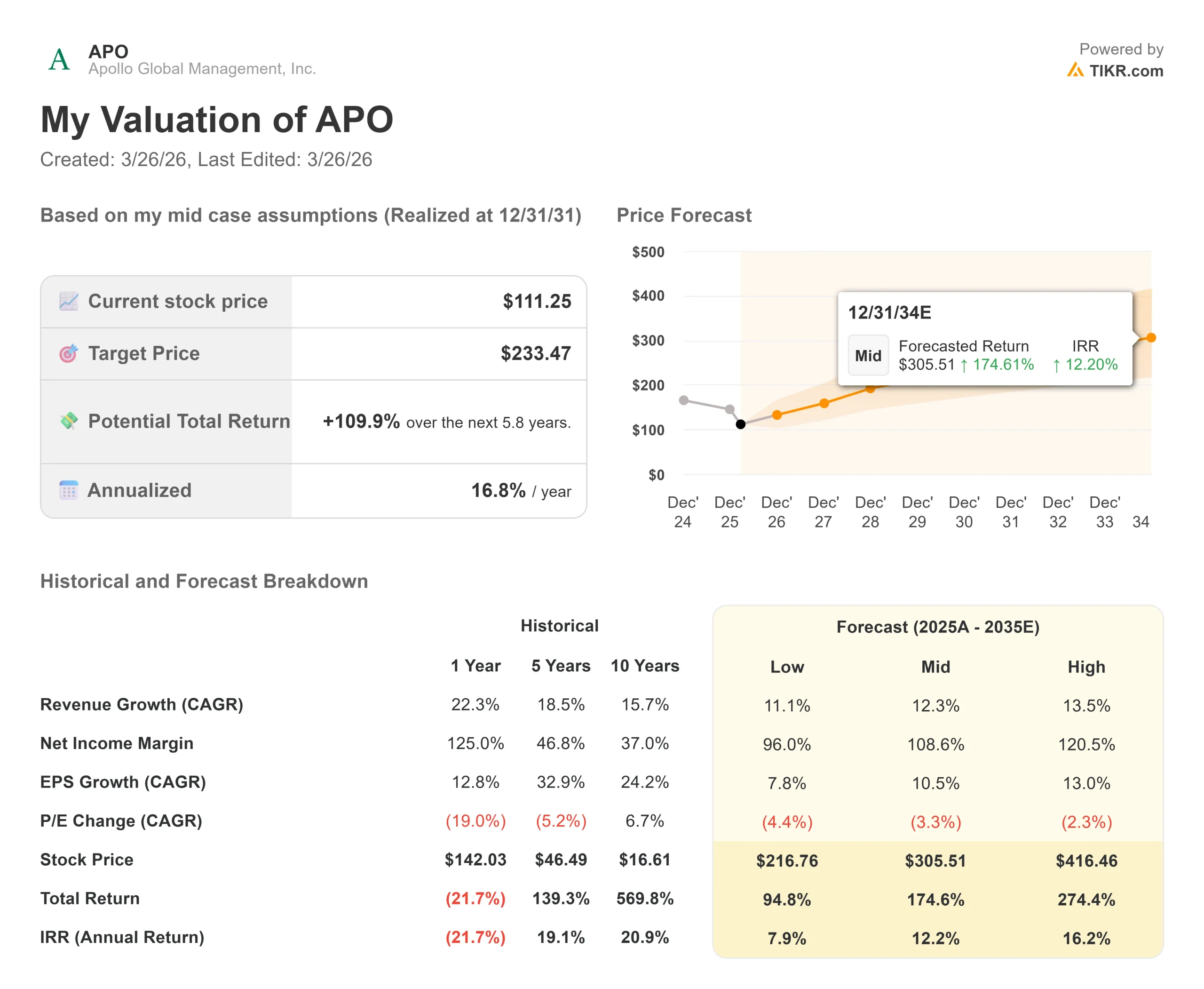 The TIKR mid-case model targets $233.47, a +109.9% total return at 16.80% annualized from today’s $111.25. Two drivers get it there: AUM compounding at 12.3% annually as Athene’s insurance inflows and global origination volume expand, and operating leverage inside the retirement services business as fixed costs scale more slowly than assets. The primary risk is sustained compression in the net spread Athene earns between its investment portfolio and what it owes annuity holders, which would reduce distributable earnings directly.