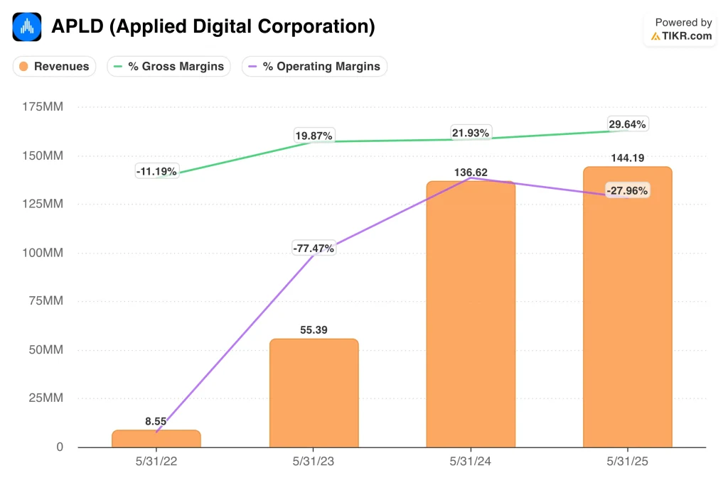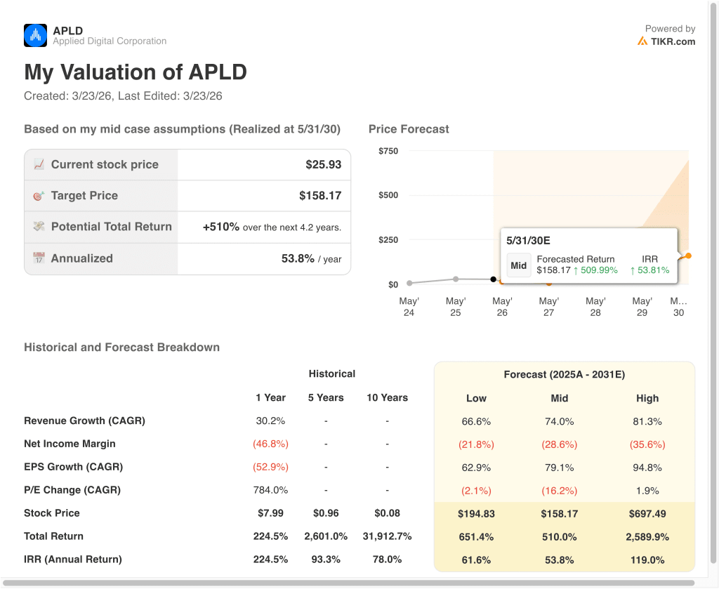 Value your favorite stocks like APLD with 5 years of analysts’ forecasts using TIKR’s new Valuation Model (It’s free) >>>