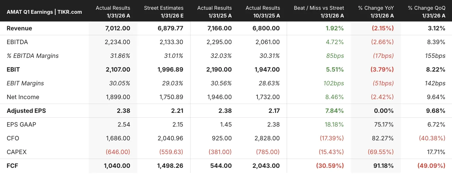 Applied Materials (AMAT) stock surged more than 8% after the company reported fiscal Q1 earnings that exceeded Wall Street expectations across nearly every major financial metric.