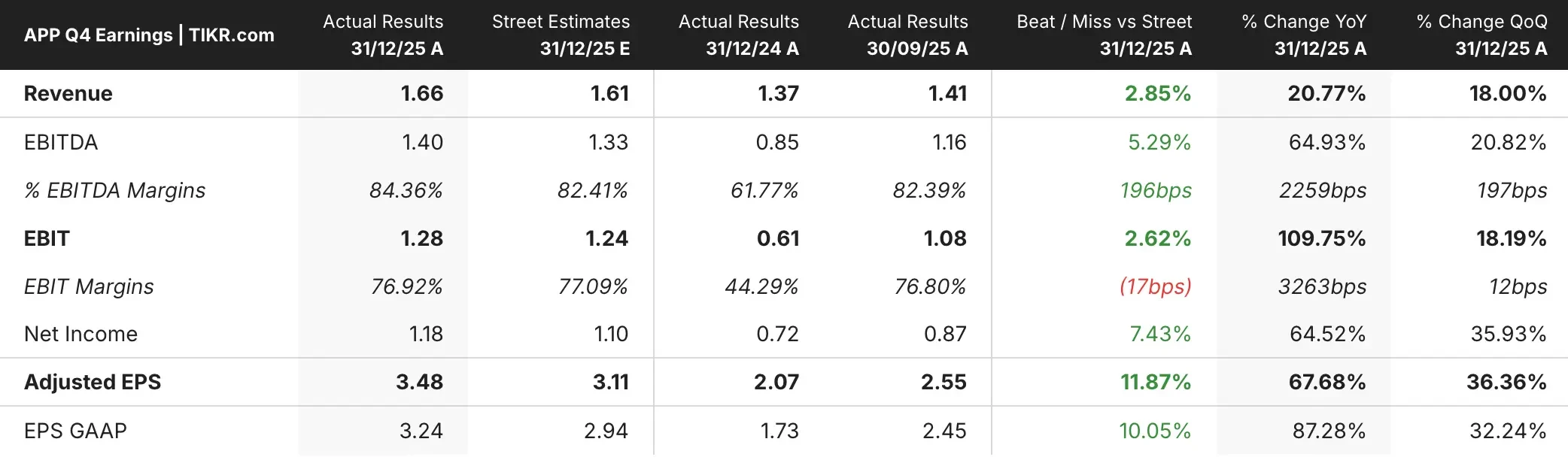 Despite the after-hours decline, AppLovin stock delivered exceptional financial performance in 2025. Full-year revenue hit $5.48 billion (up 70%), adjusted EBITDA reached $4.51 billion (82% margin), and free cash flow totaled $3.95 billion.