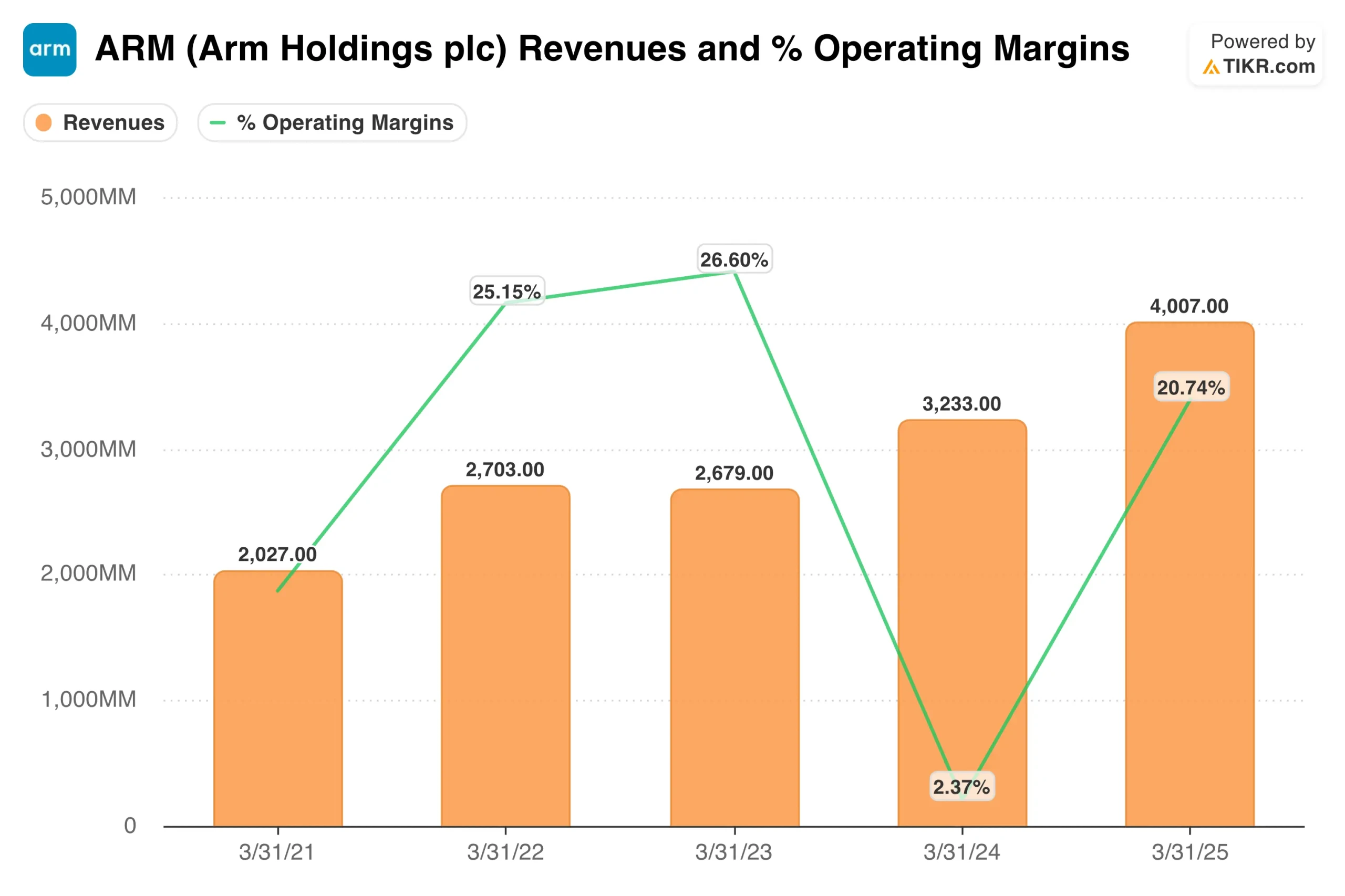 Arm’s growth outlook is supported by strong revenue expansion, with total revenue reaching about $4.7B over the last twelve months. This reflects continued demand for its CPU designs across smartphones, data centers, and AI-driven applications. Because Arm licenses its technology rather than manufacturing chips, growth scales efficiently as adoption increases.