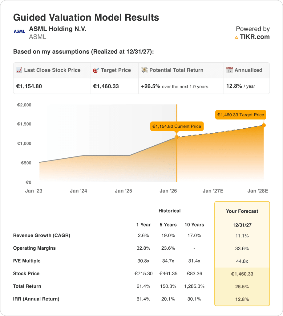 The valuation model assesses ASML through fiscal 2027, dependent on revenue growth, margin expansion, and exit multiple assumptions.