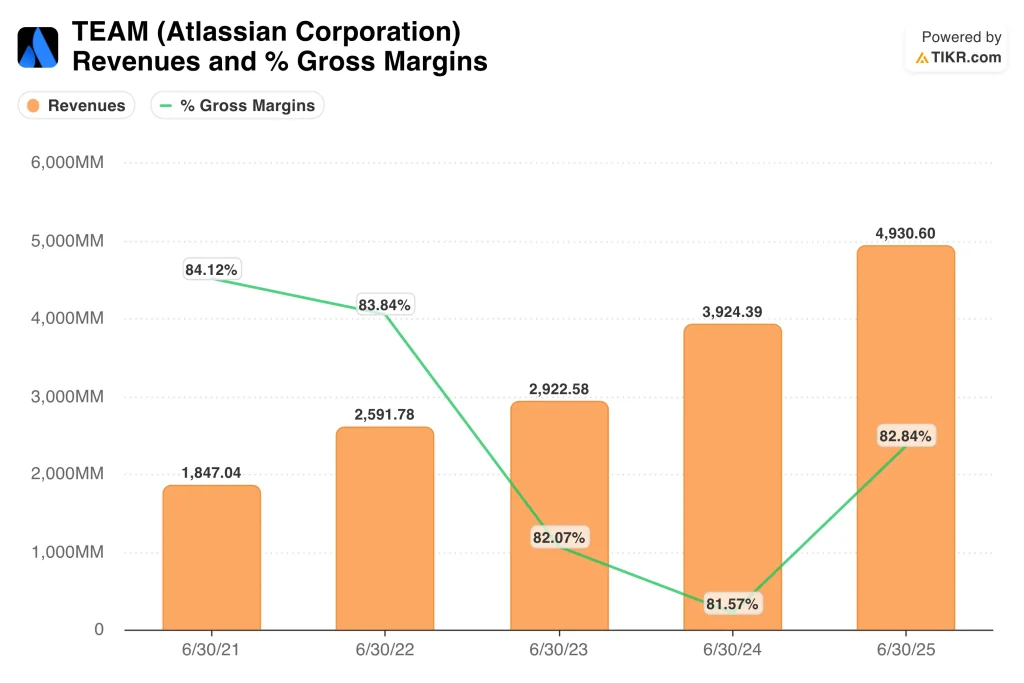 The core business still supports a premium growth narrative. Total revenue rose to $5.76 billion on an LTM basis, gross margin reached 84.1%, and the forward two-year revenue CAGR in the overview is about 19.9%. Those numbers matter because Atlassian’s products, led by Jira and Confluence, remain deeply embedded in software development, IT service management, and enterprise workflows.