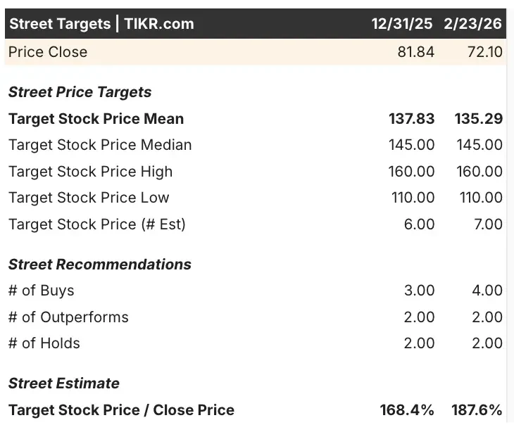 Street Targets data shows analysts have maintained bullish long-term views following the IPO. However, the gap between targets and the current price highlights increased uncertainty around execution and valuation.