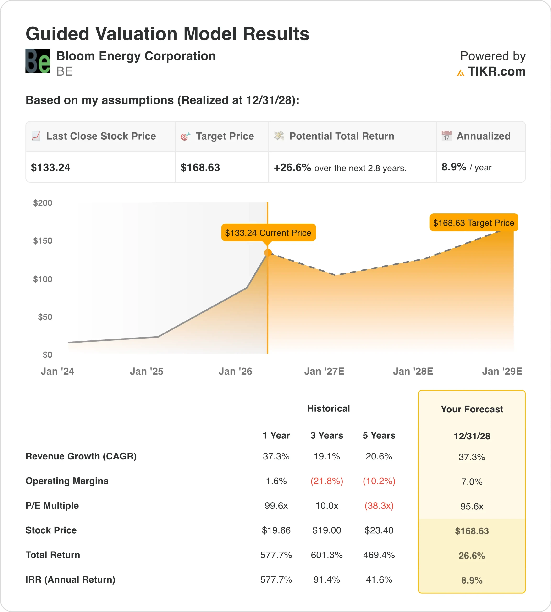 Value your favorite stocks like Bloom Energy with 5 years of analysts’ forecasts using TIKR’s new Valuation Model (It’s free) >>>