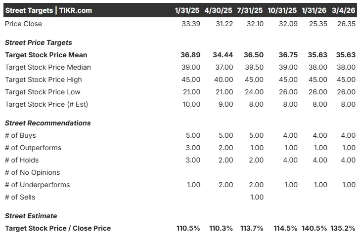 The consensus Street target price of $35.63 represents an attractive 35.22% potential return from the current $26.35 baseline.