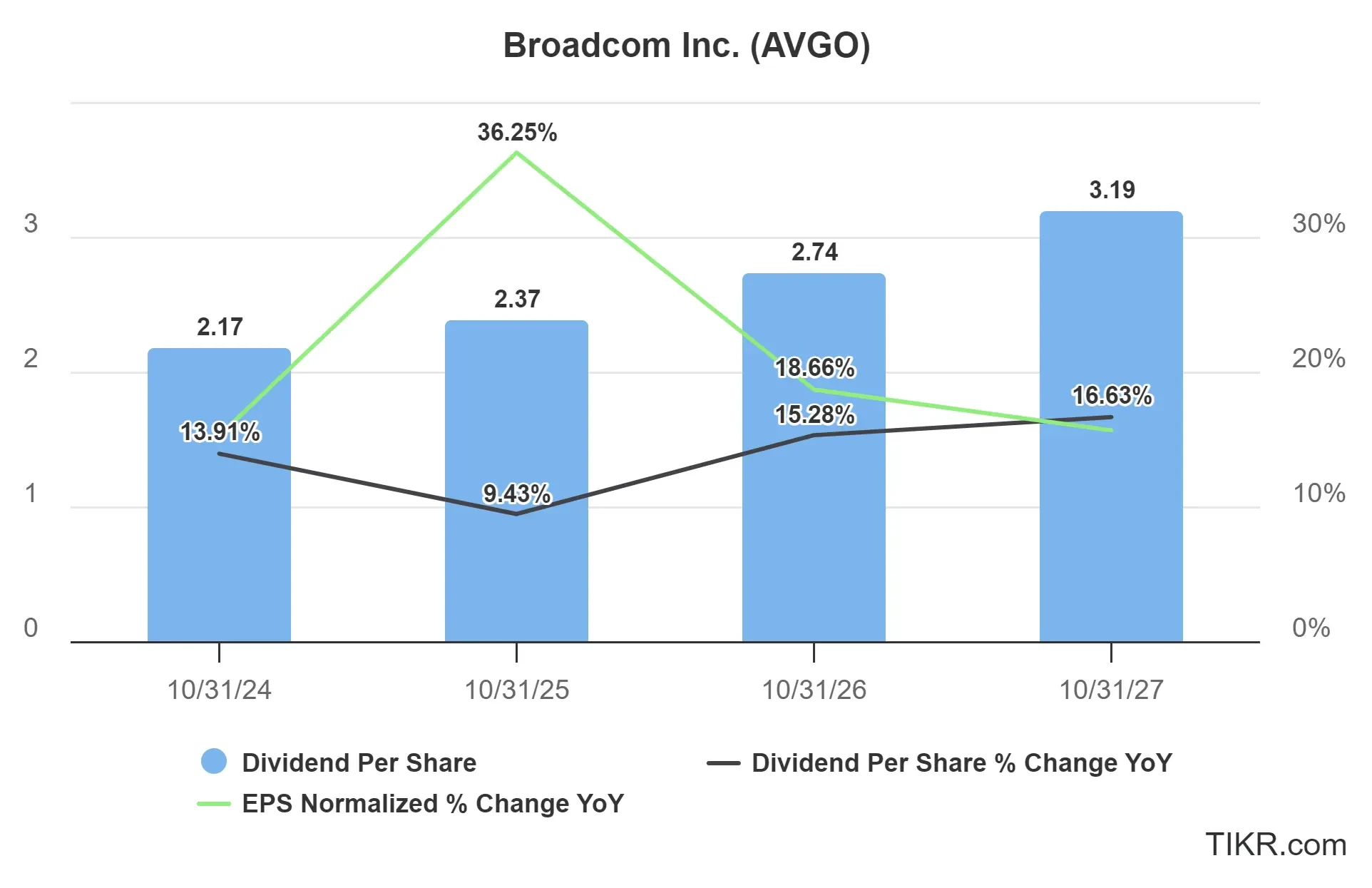 Compared to other semiconductor and tech companies, Broadcom’s yield is actually above average. That’s a good sign because it means you’re getting paid to wait for the dividend to grow and for the stock to reach fair value while the business keeps growing.