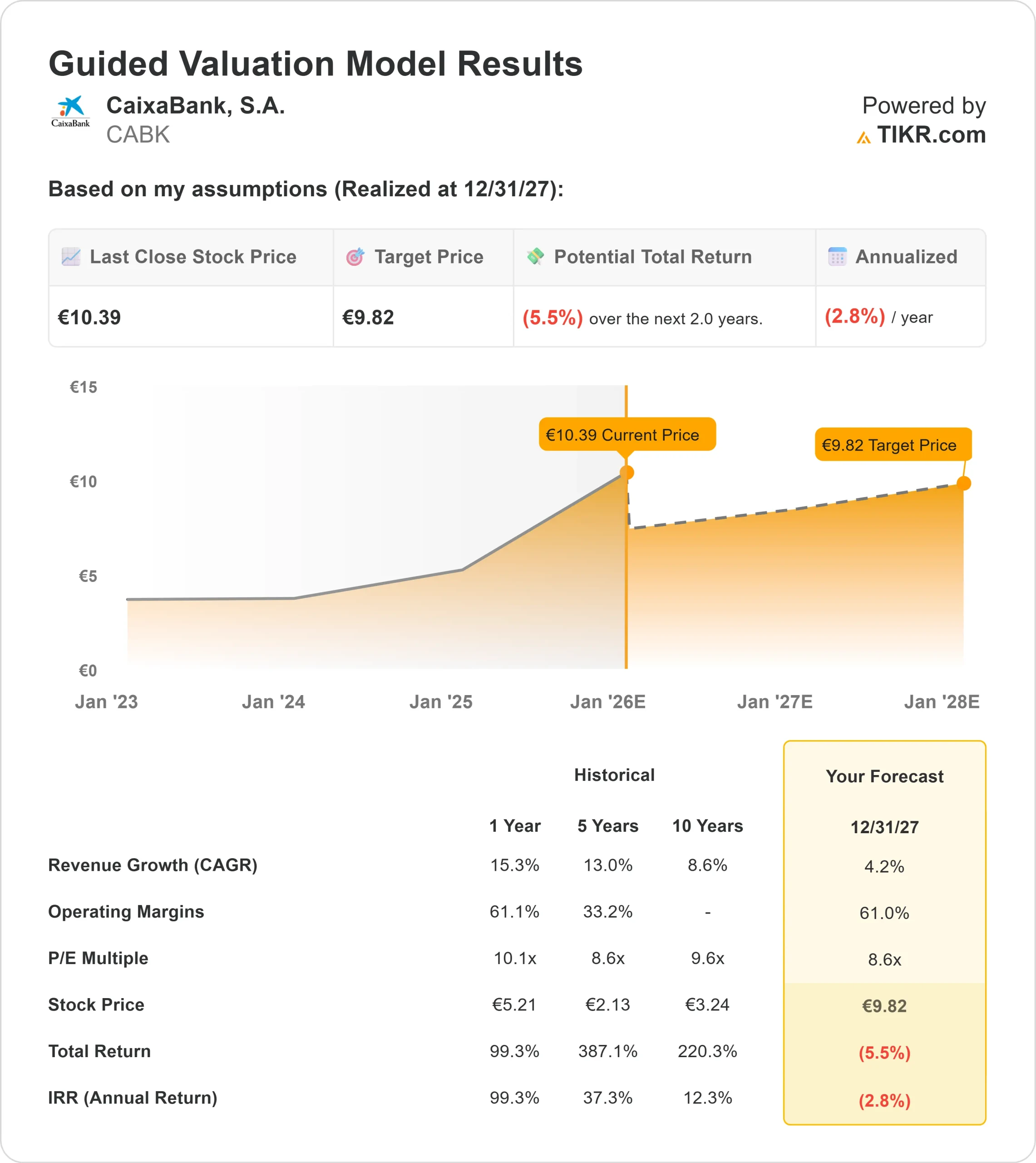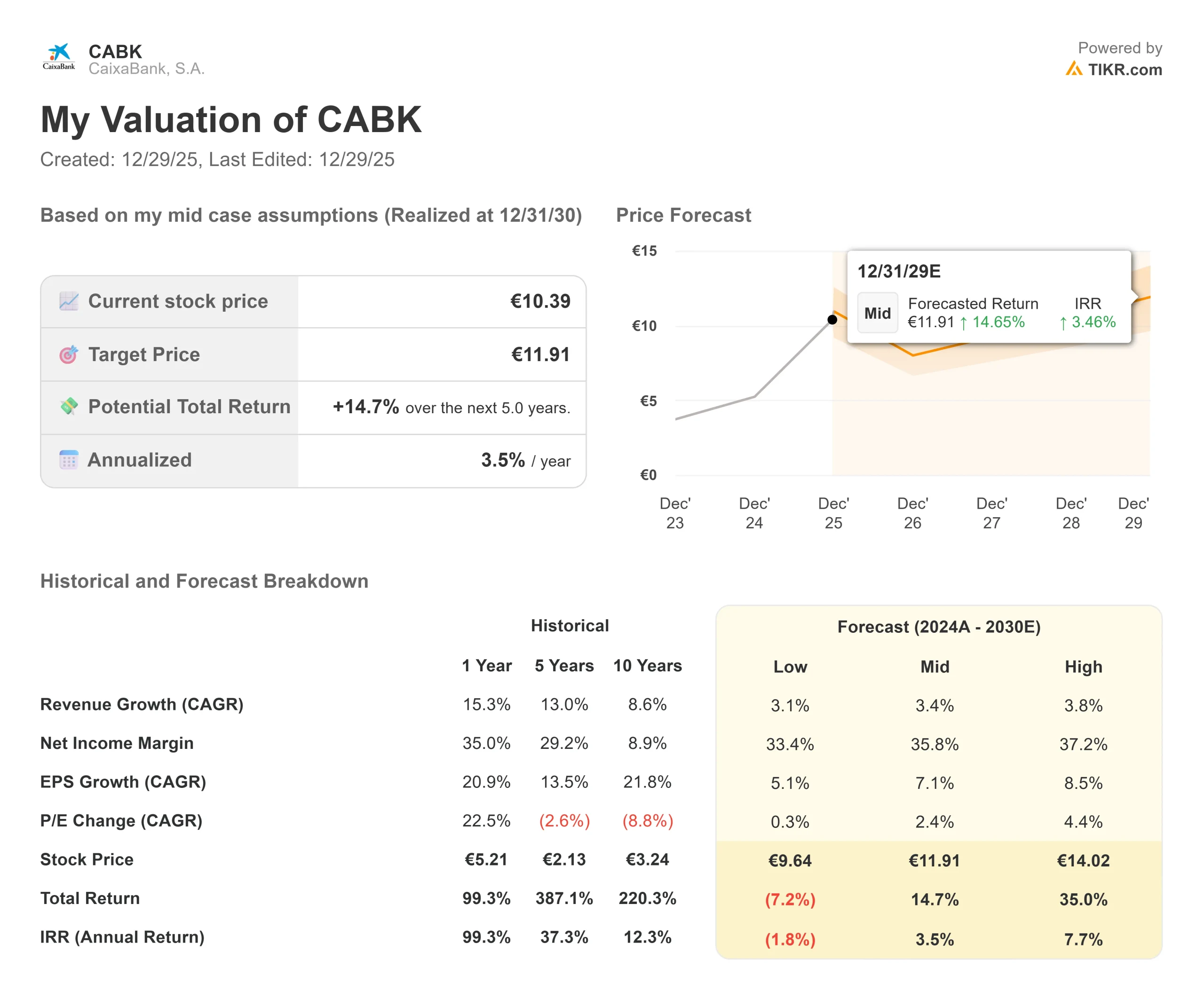 CABK stock trades at a premium multiple reflecting its status as the highest-quality bank in Spain with the most stable earnings profile.