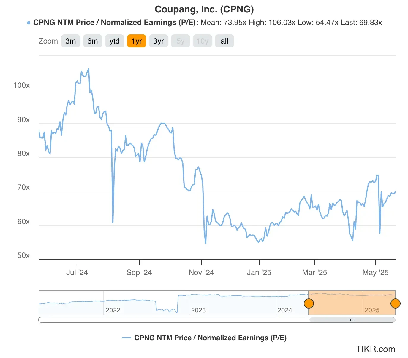 Today, Coupang stock trades at around 70x forward earnings, below its 12-month historical average P/E of 74x, as shown in the valuation chart.