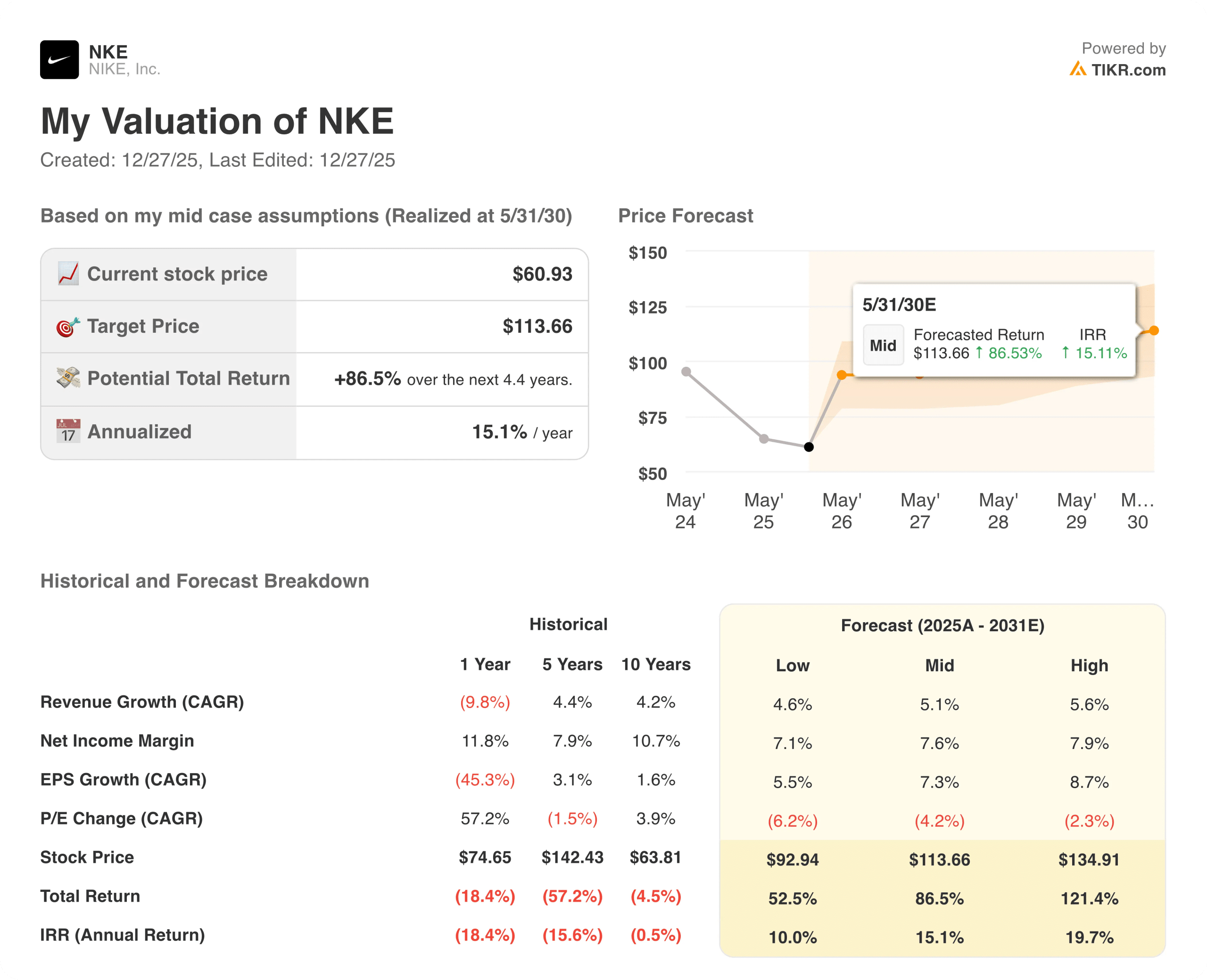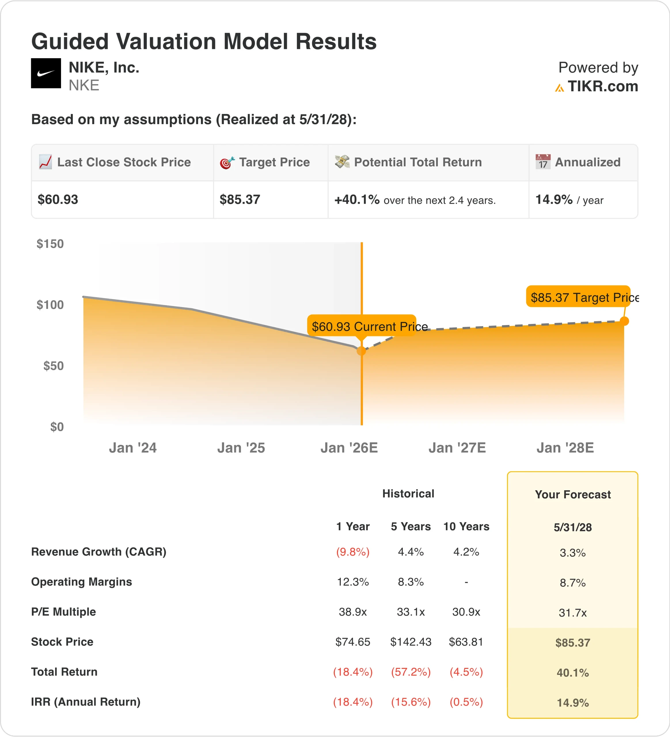 Under these assumptions, Nike could reach $85 by May 2028, implying a 40% total return or 15% annually.