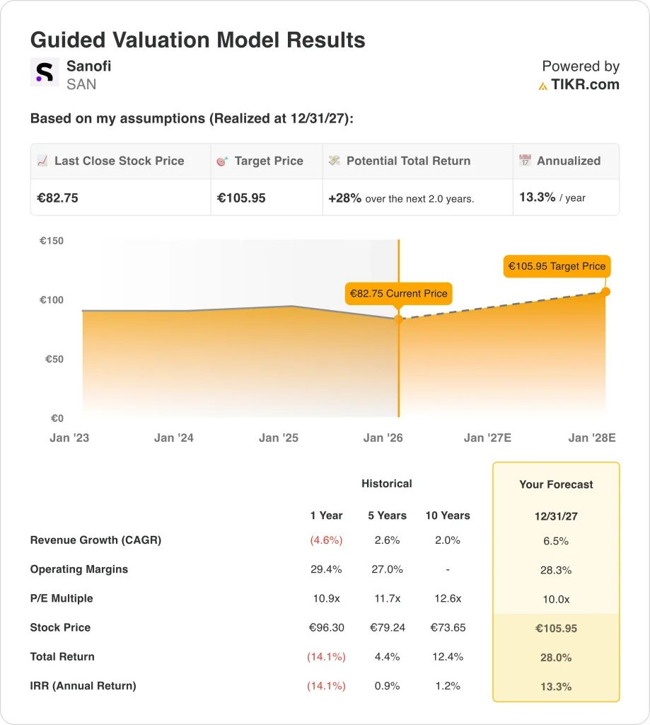 Based on estimates of 6.5% annual revenue growth, 28.3% net income margins, and a normalized exit P/E multiple of 10x, the model projects Sanofi stock could rise from €83 to €106 per share in the next 2 years.