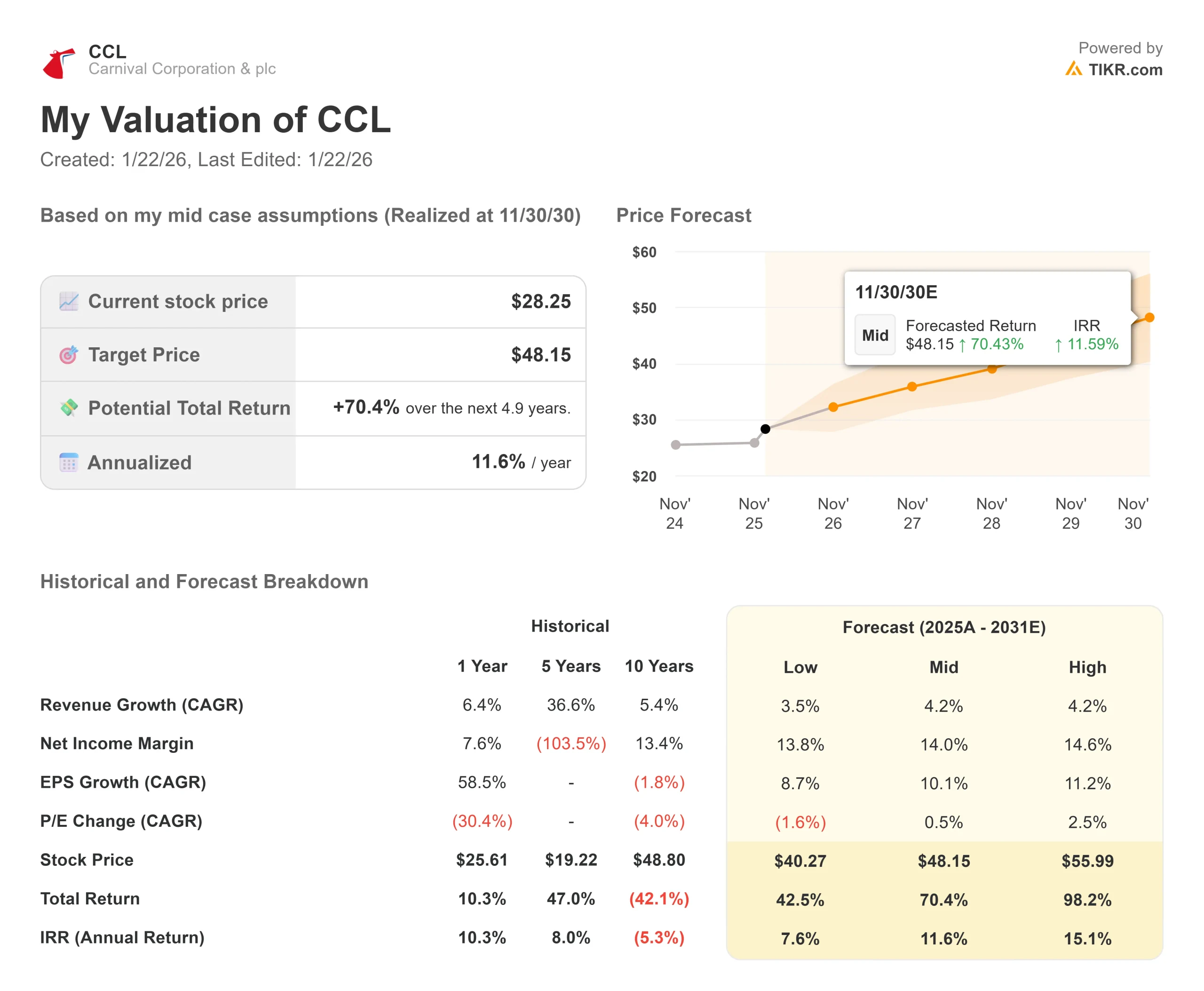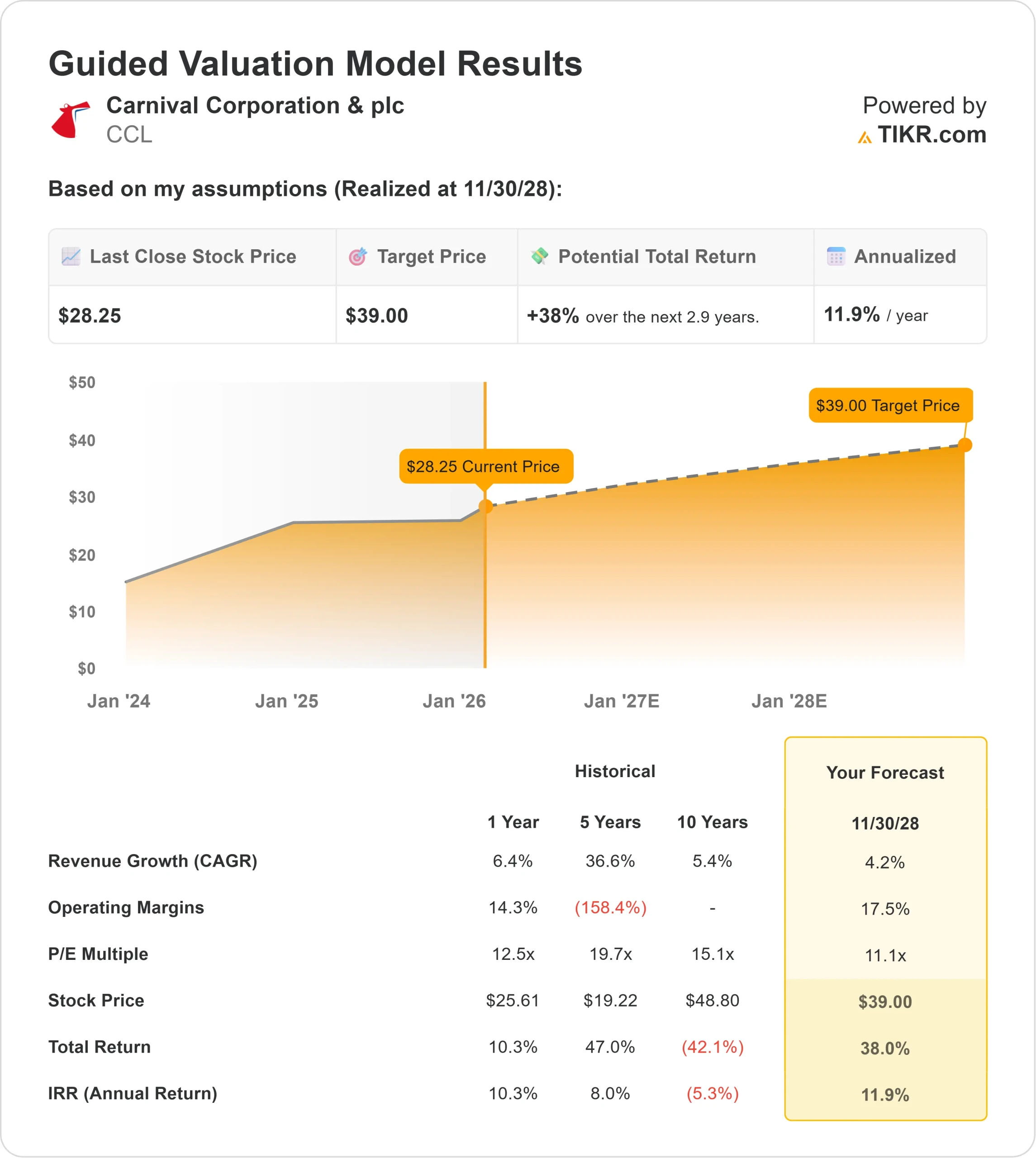 - Low Case: If a recession hits leisure travel, the model points to a price of $40, offering a defensive 7.6% annual return.