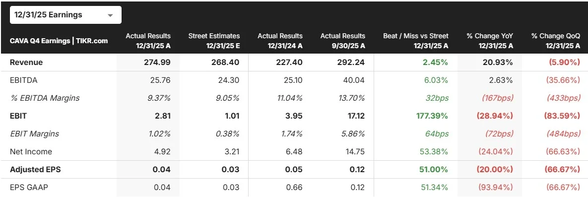 - The strong performance marked a significant milestone for Cava, which surpassed $1 billion in annual revenue for the first time in fiscal 2025.