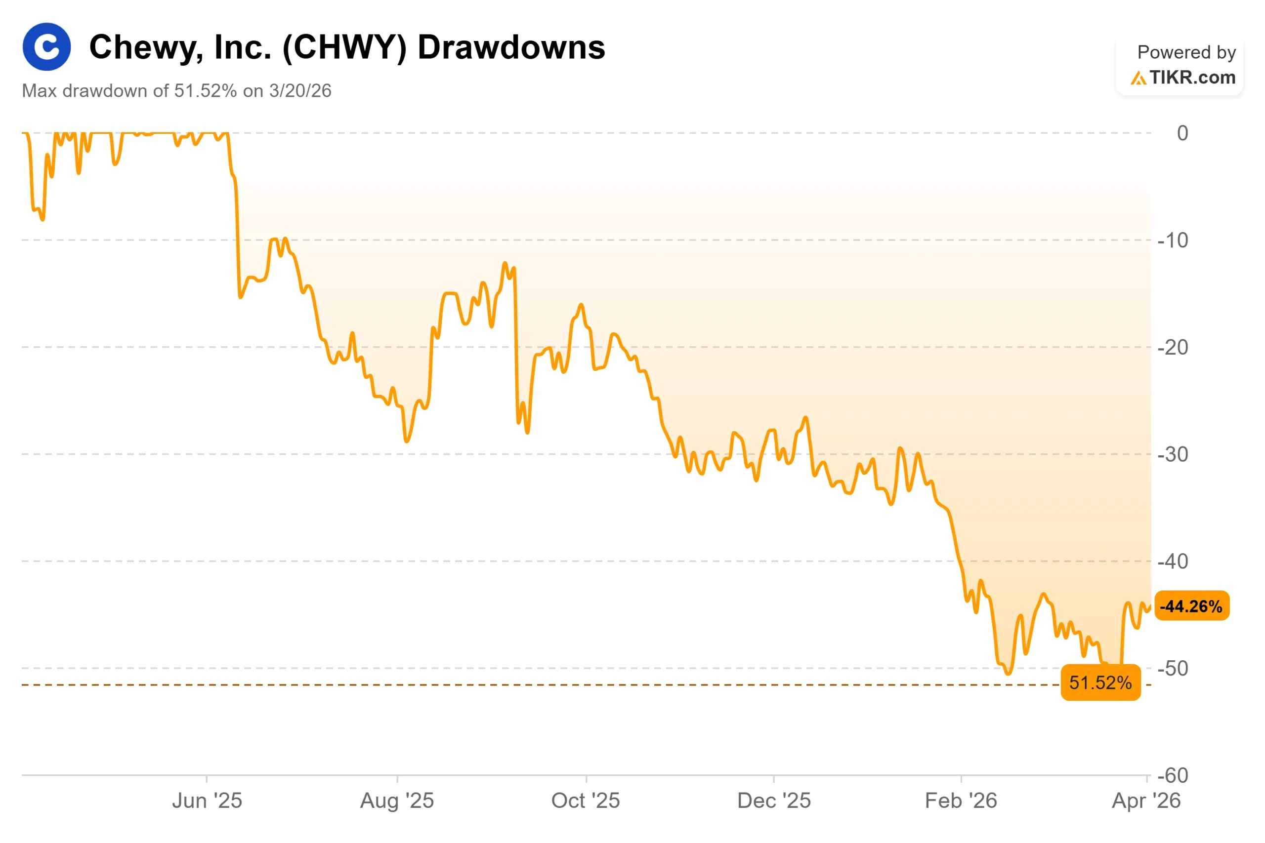 Chewy (CHWY) trades at $26.87 today, down nearly 45% from its 52-week high of $48.62, with a max drawdown of 51.52% reached on March 20, 2026.