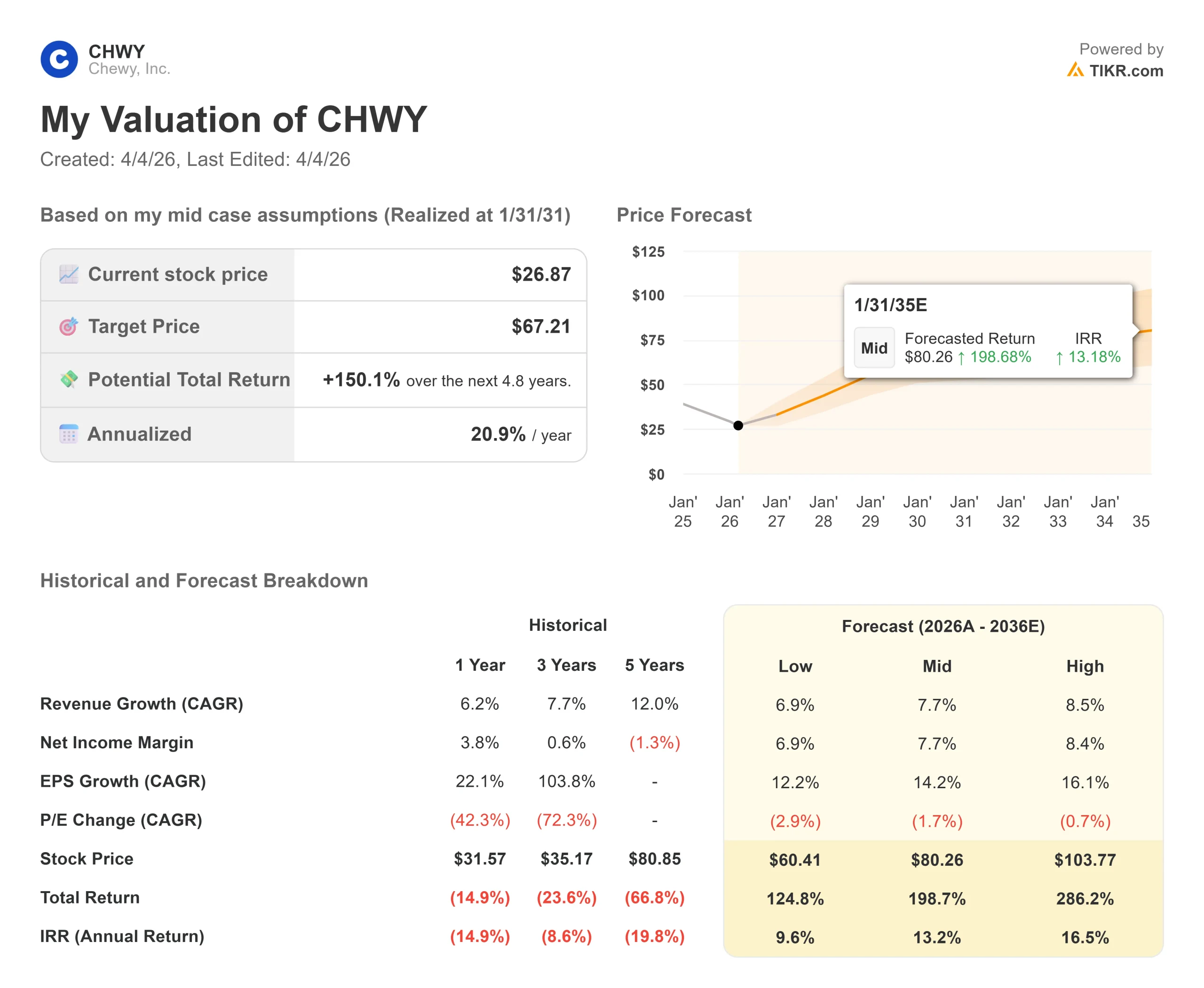 The TIKR mid-case model prices Chewy at $67.21 by January 31, 2031, a 150.1% total return from $26.87 at an annualized IRR of 20.9% over approximately 4.8 years. The model is built on a 7.7% revenue CAGR and net income margins expanding to 7.7%, against a trailing one-year net income margin of 3.8%.