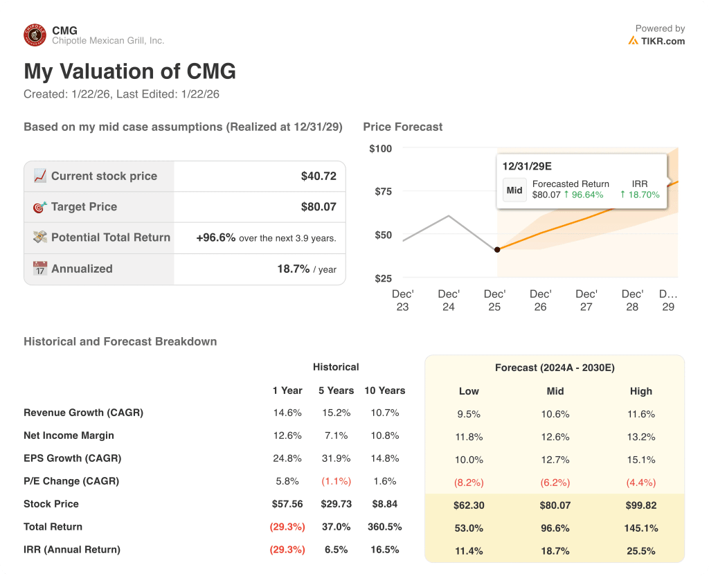 - Potential Return: CMG shows 35% total upside from $41 to $55 over about 2 years, reflecting modest multiple compression.