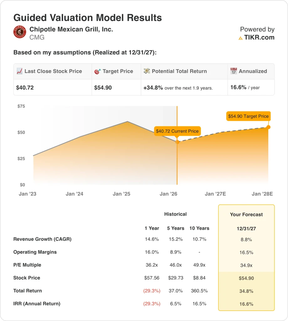 CMG stock currently trades near $41 per share and the model targets $55 by 2027 as returns depend on 9% growth.