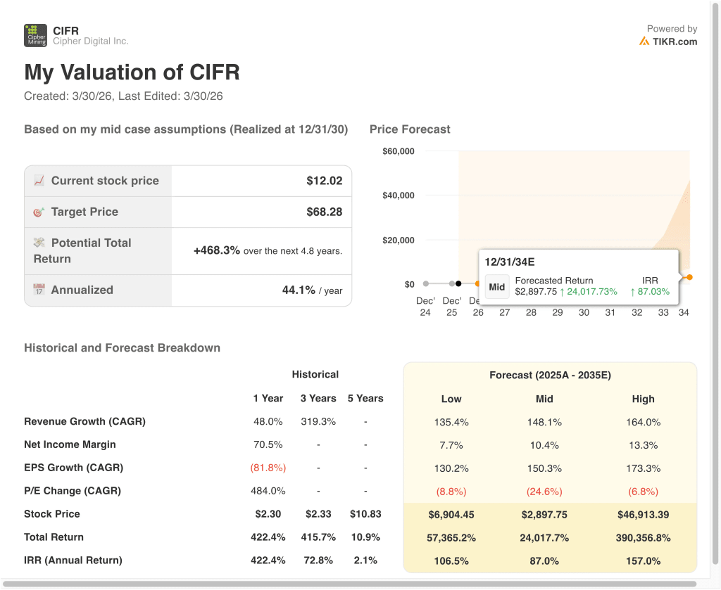 Value your favorite stocks like CIFR with 5 years of analysts’ forecasts using TIKR’s new Valuation Model (It’s free) >>>