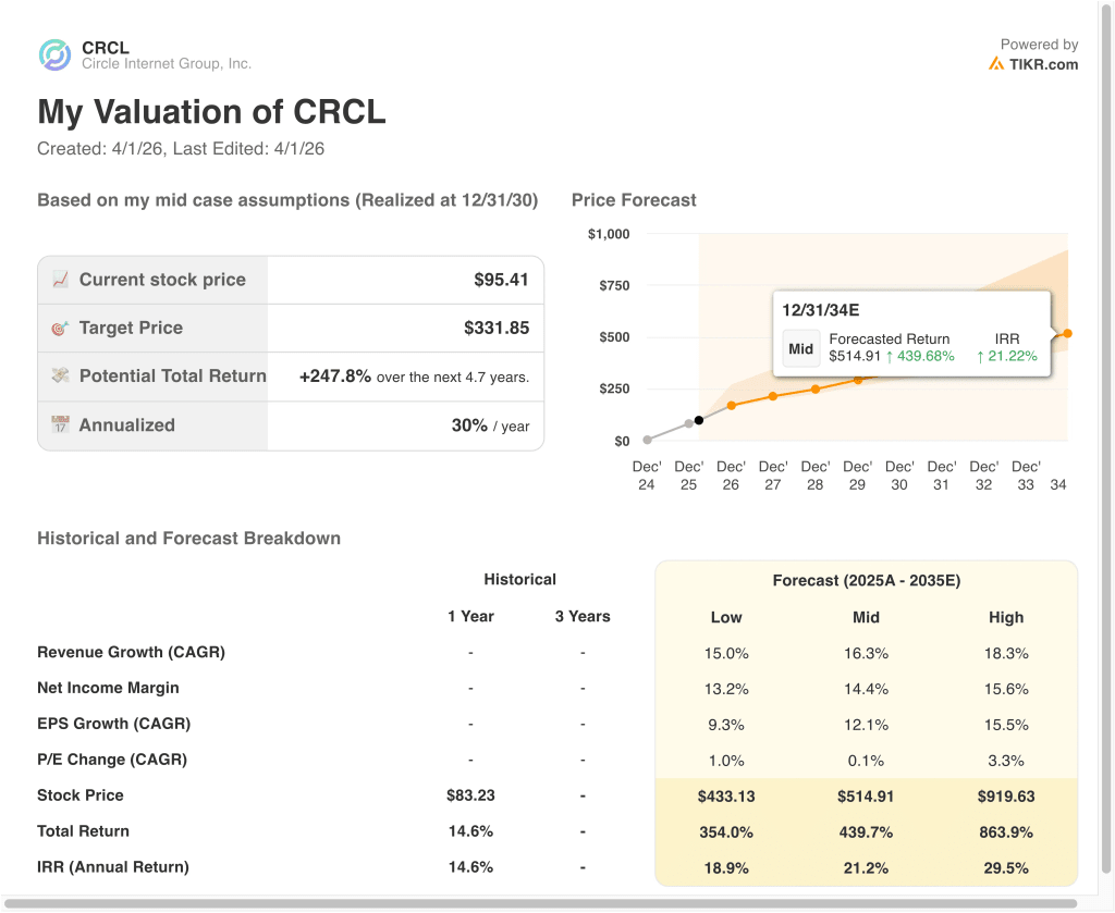 Pull up CRCL, and you’ll see years of historical financials, what Wall Street analysts expect for revenue and earnings in the quarters ahead, how valuation multiples have moved over time, and whether price targets are trending up or down.