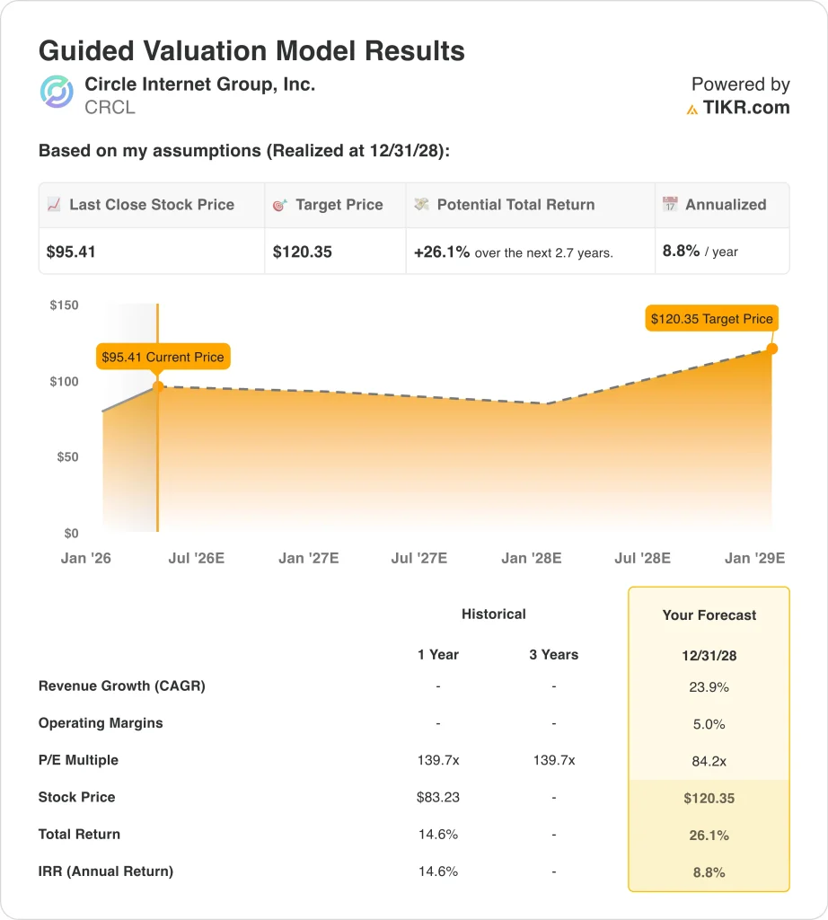Based on estimates of 23.9% annual revenue growth, 5.0% operating margins, and a normalized P/E multiple of 84.2, the model projects Circle stock could rise from $95 to $120 per share.