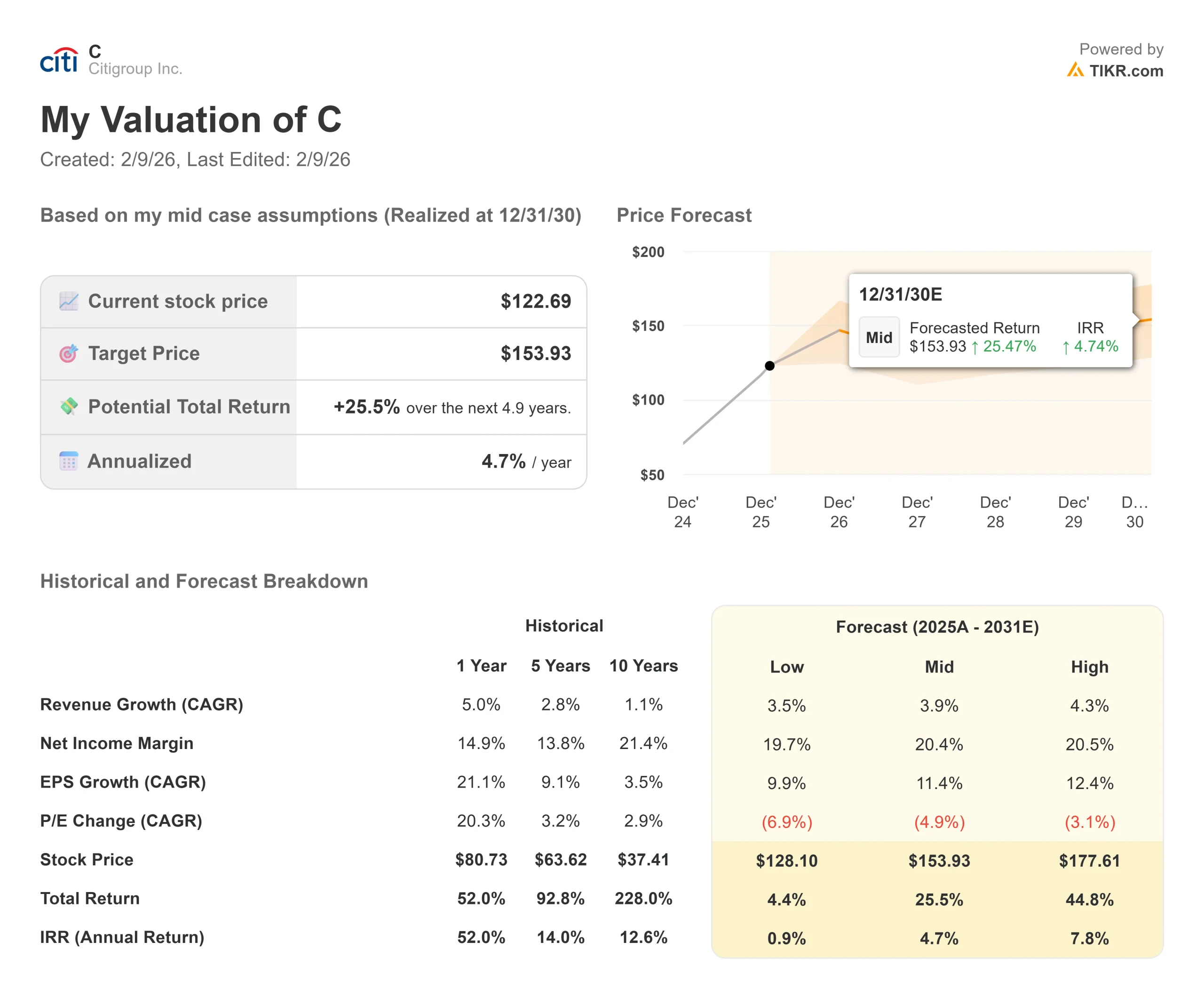 If Citigroup can hit its target of 10-11% RoTCE in 2026, the path to $154 is supported by fundamental earnings power and a re-rating of the stock’s multiple.