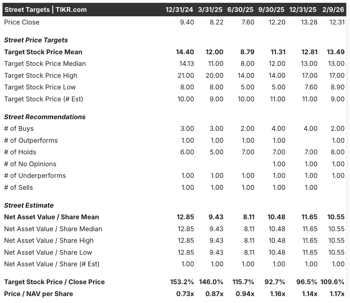 Street expectations are mixed. The latest Street Target mean is about $13, which is close to the current share price and signals muted upside expectations.