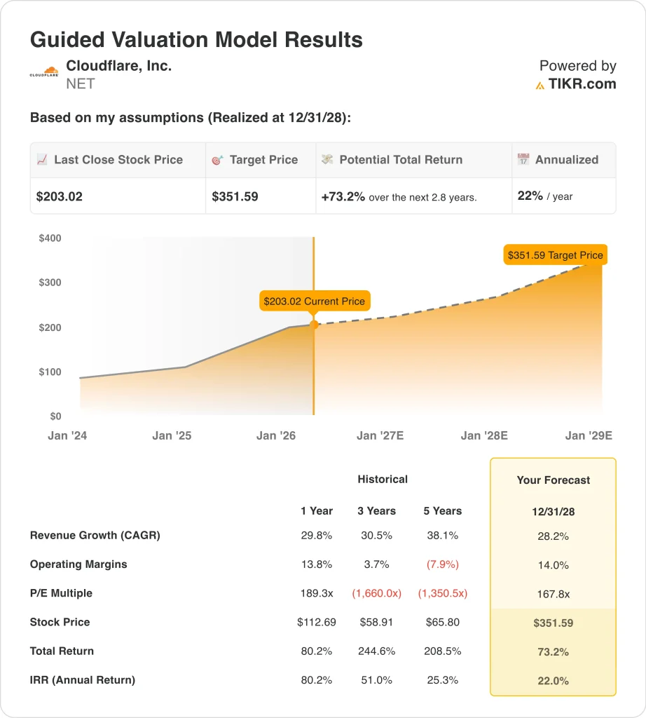 Value your favorite stocks like NET with 5 years of analysts’ forecasts using TIKR’s new Valuation Model (It’s free) >>>