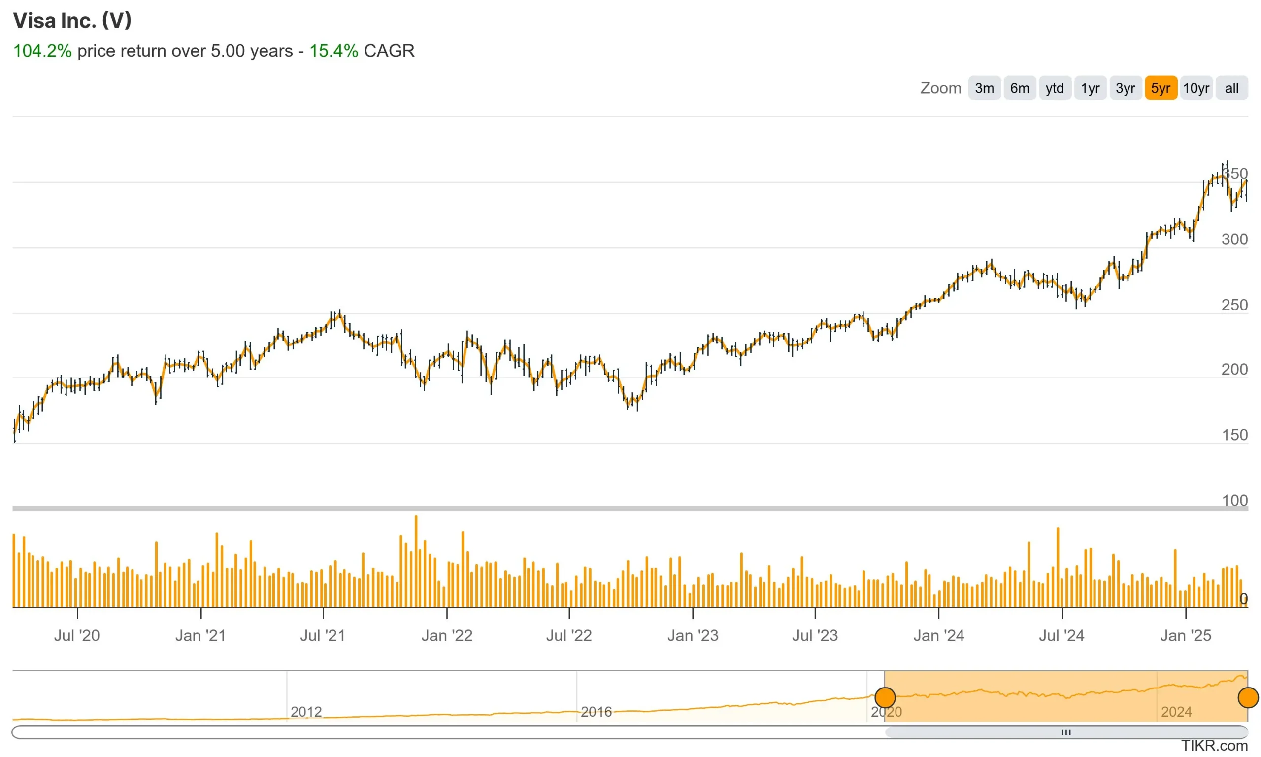 Example: Consider two stocks – Visa and Mastercard. They traded at different prices and saw similar growth, so it’s hard to see which stock has a better price performance at first glance. However, when you look at the CAGR figure, you can see that Mastercard saw higher price growth with a 15.6% CAGR, while Visa saw a 15.4% CAGR.