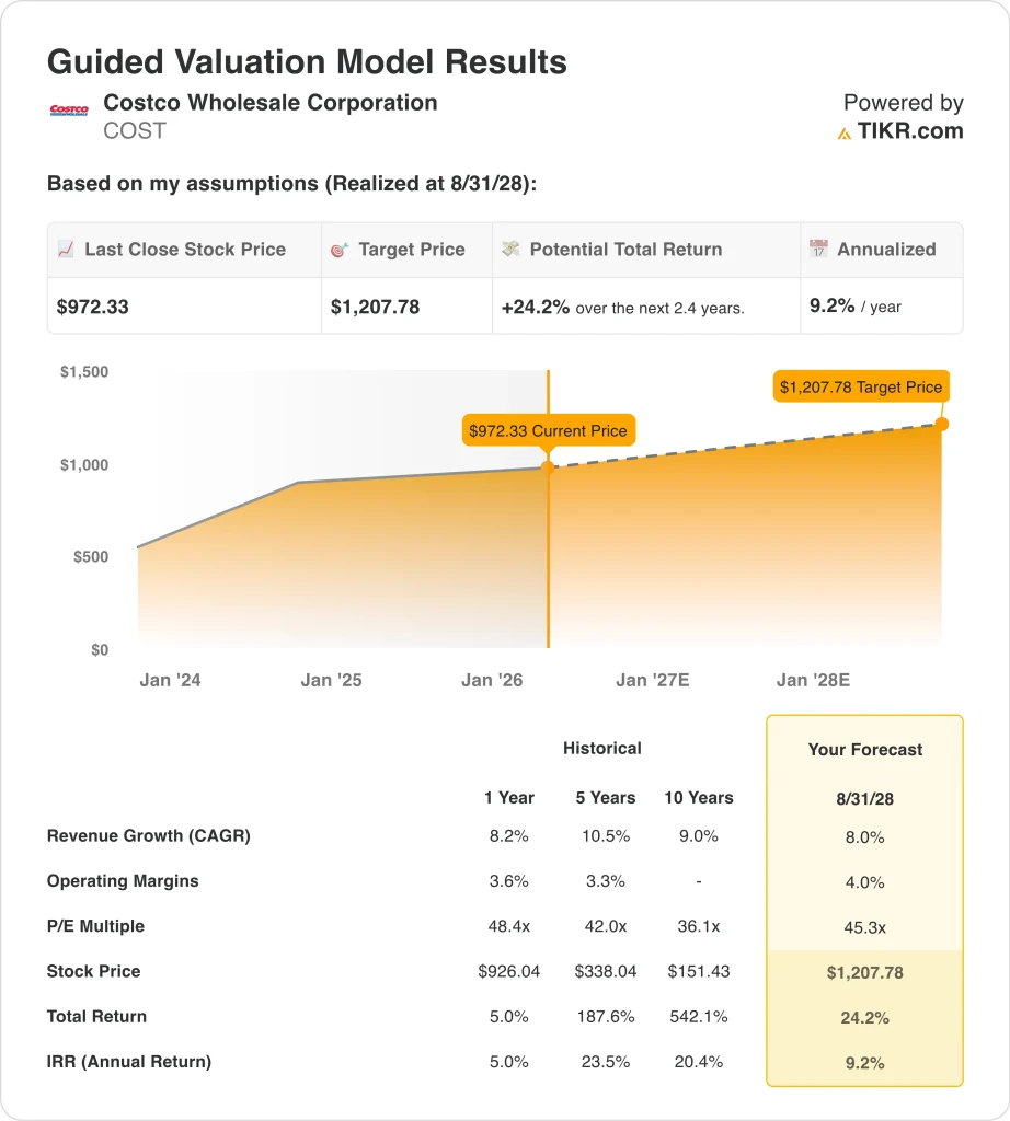 Value your favorite stocks like COST with 5 years of analysts’ forecasts using TIKR’s new Valuation Model (It’s free) >>>