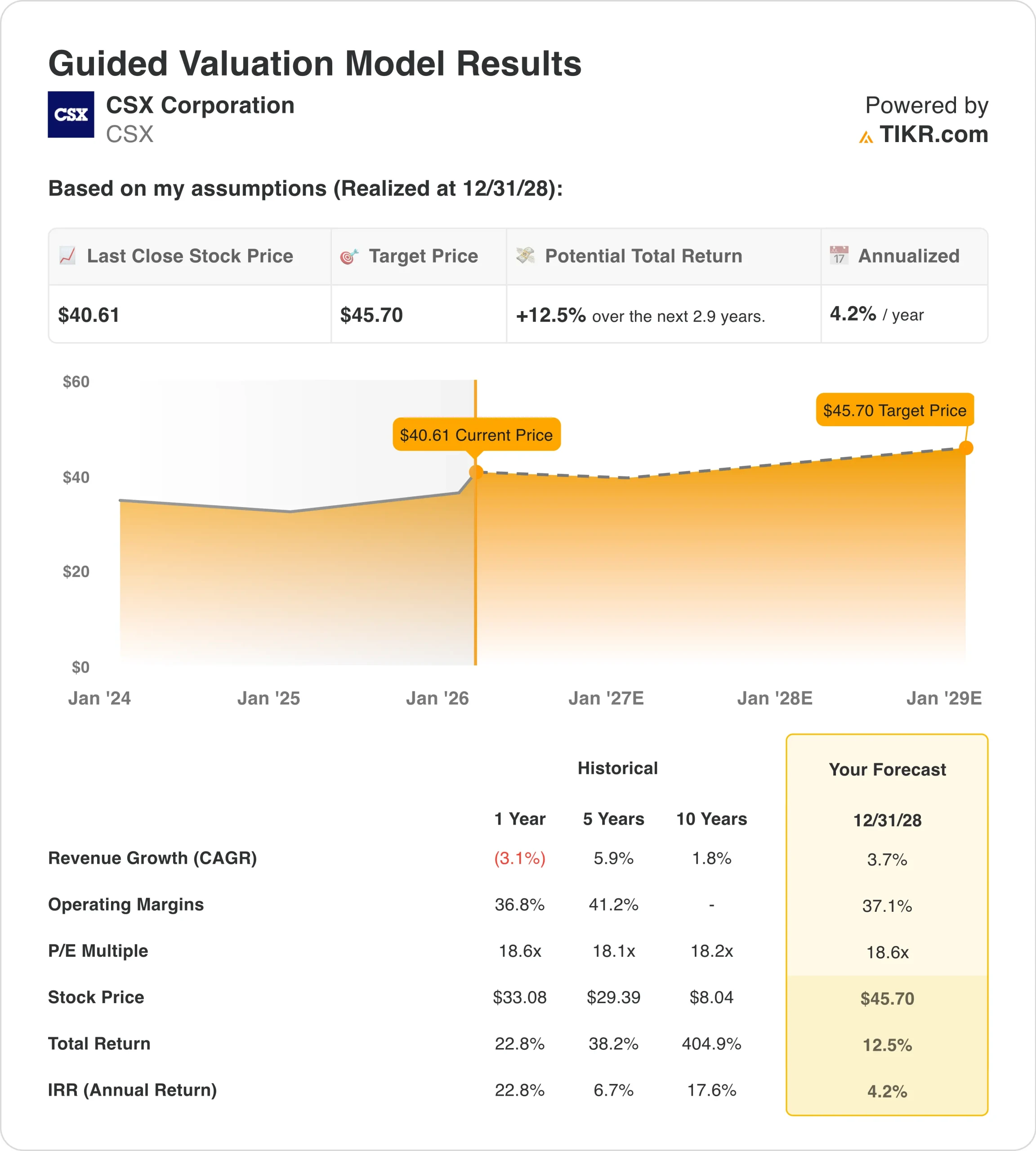 Value your favorite stocks like CSX with 5 years of analysts’ forecasts using TIKR’s new Valuation Model (It’s free) >>>
