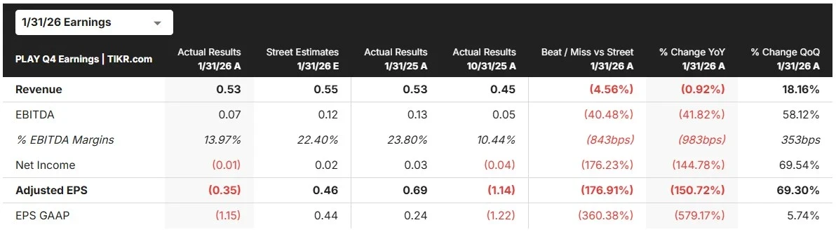Dave and Buster’s (PLAY) stock rose by 8% on Tuesday and another 3% in pre-market on Wednesday after the company reported Q4 results and laid out a confident outlook for 2026, even though the quarter itself came in below expectations.