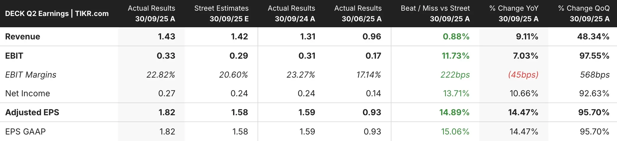 The weak outlook completely overshadowed strong fiscal Q2 results. The footwear maker reported revenue of $1.43 billion and adjusted earnings of $1.82 per share, beating estimates of $1.42 billion and $1.58 per share, respectively.