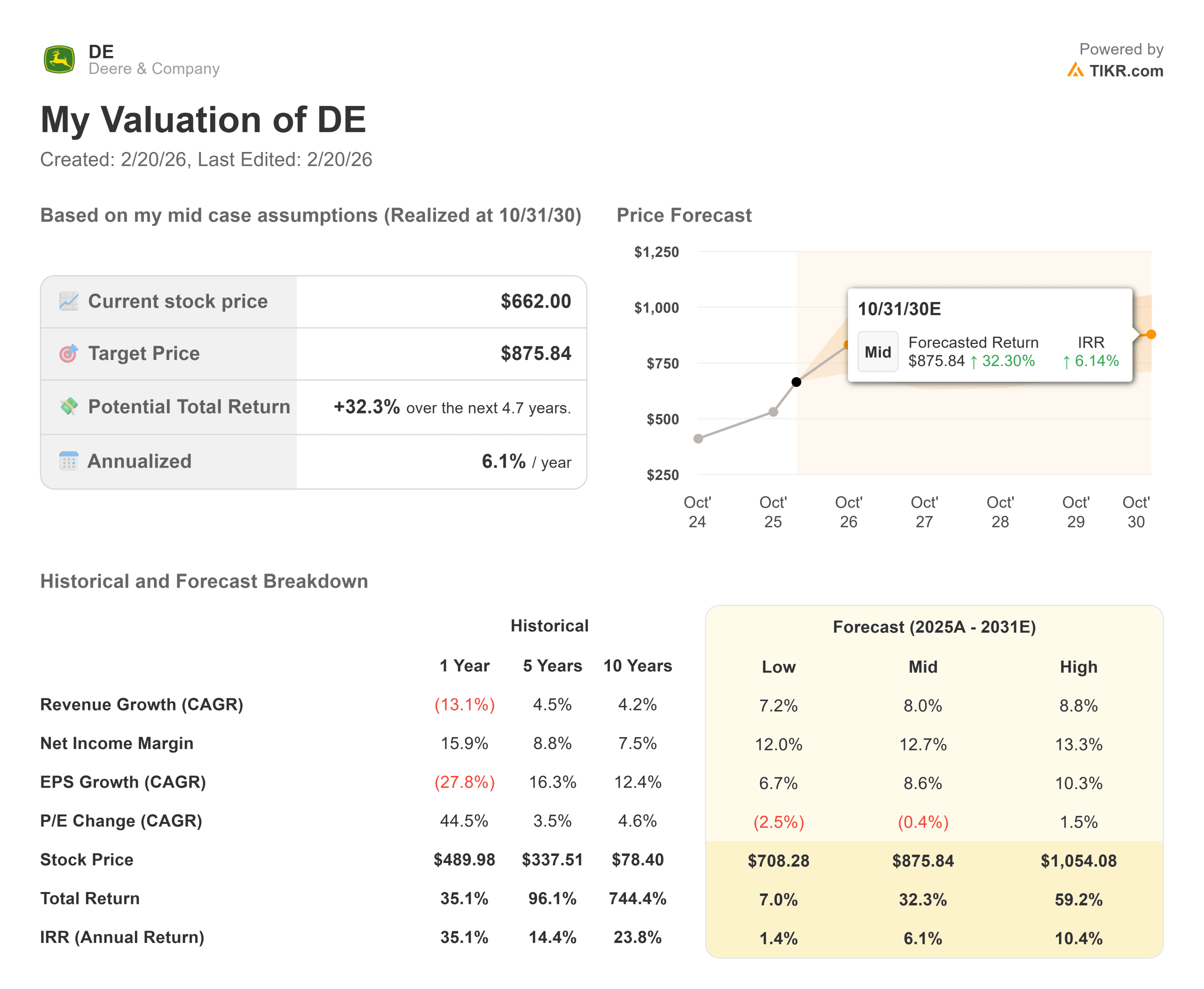Margin Expansion Through Tech: Deere is no longer just a hardware company. It is a highly profitable software and technology provider. With over 500 million “engaged acres” utilizing Deere’s precision agriculture technology, the company is locking farmers into a high-margin ecosystem. The model projects that this recurring revenue will provide a steady baseline of cash flow even in weaker commodity markets.