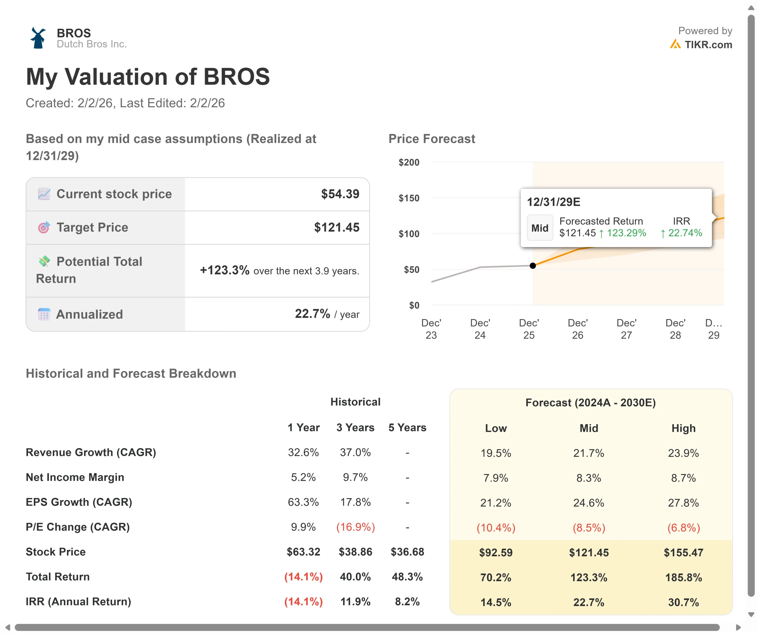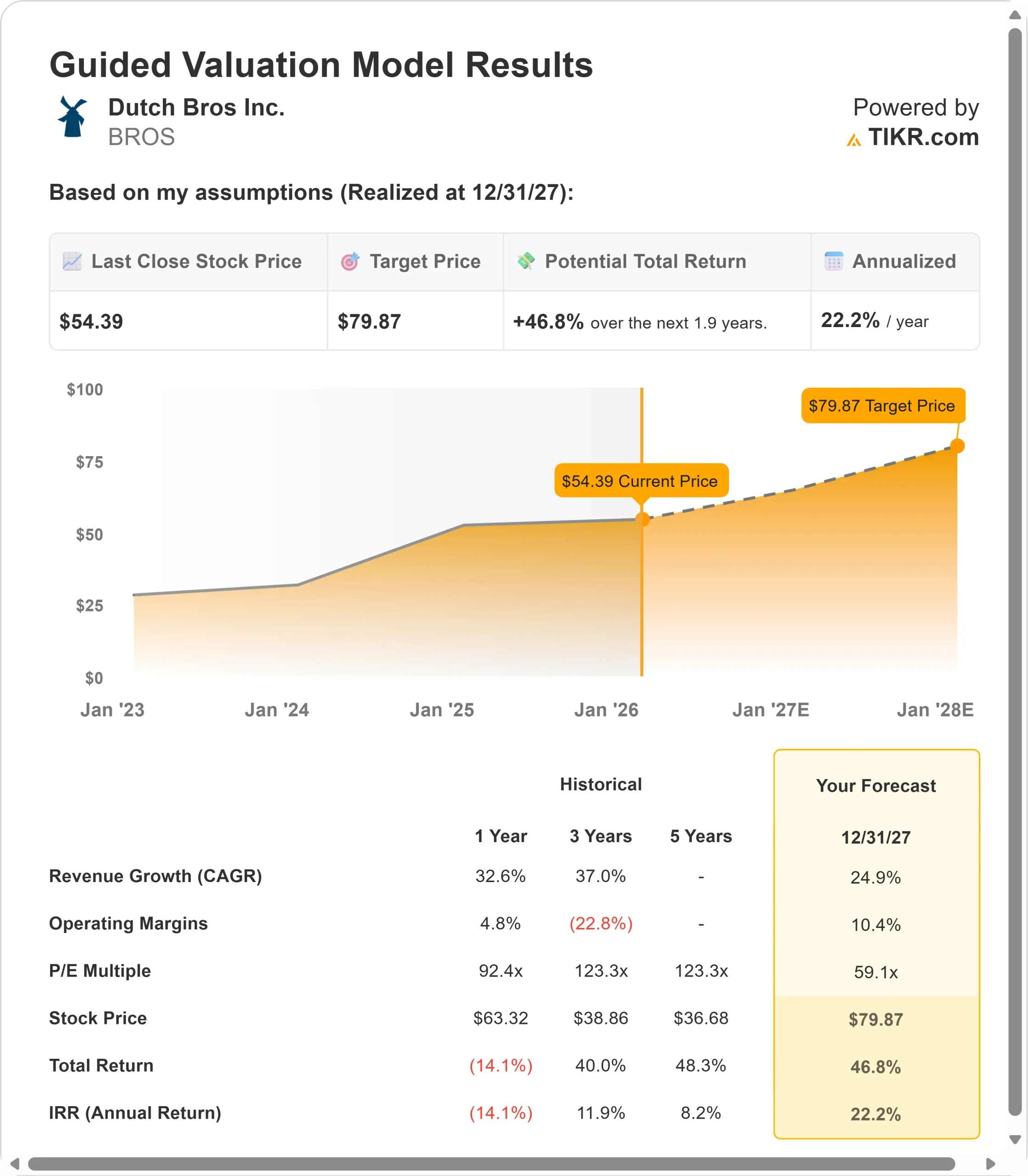 - High Case: If transaction initiatives exceed expectations and Dutch Bros maintains 8.7% margins while growing at 23.9%, total returns could reach 186% (30.7% annually).