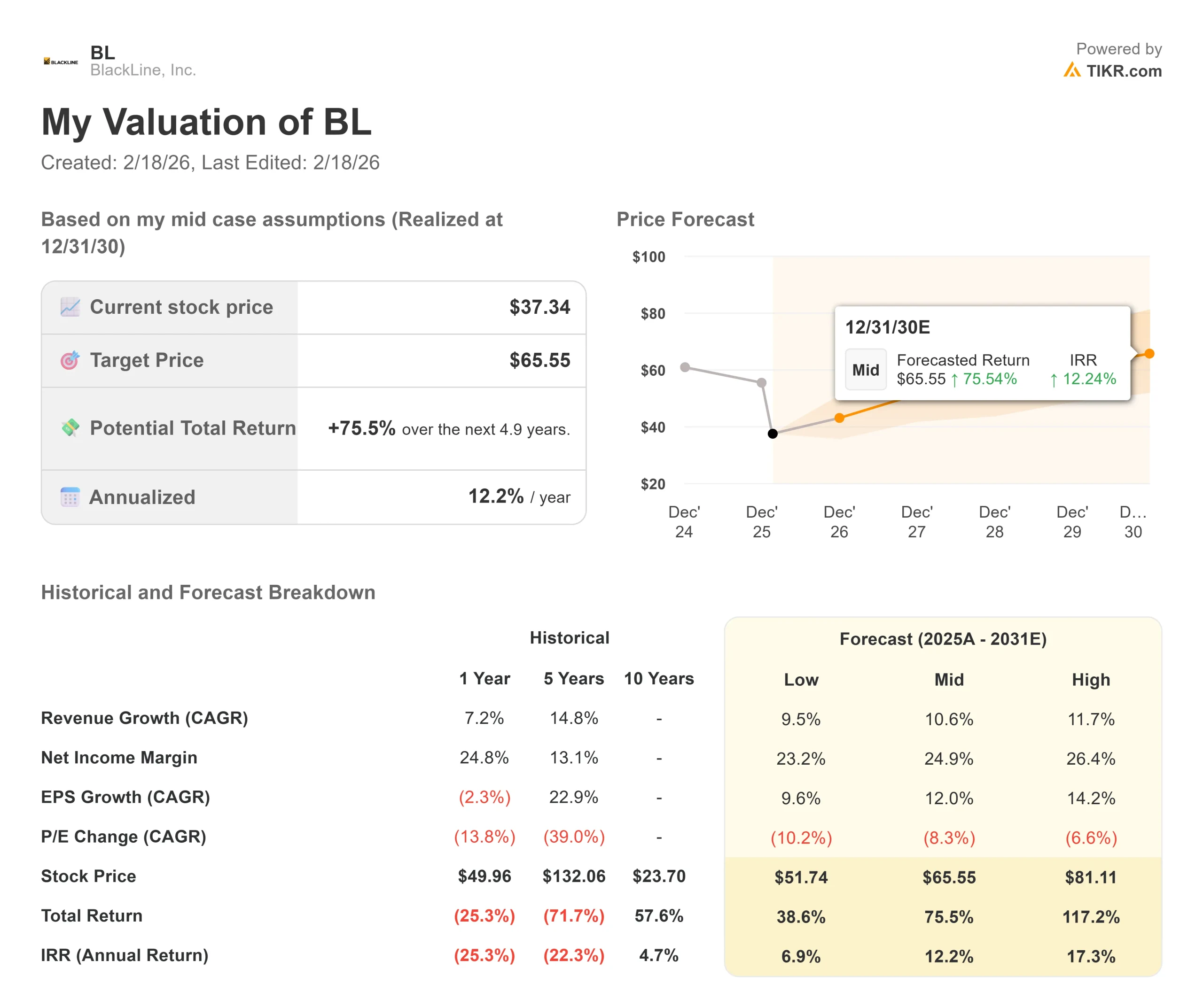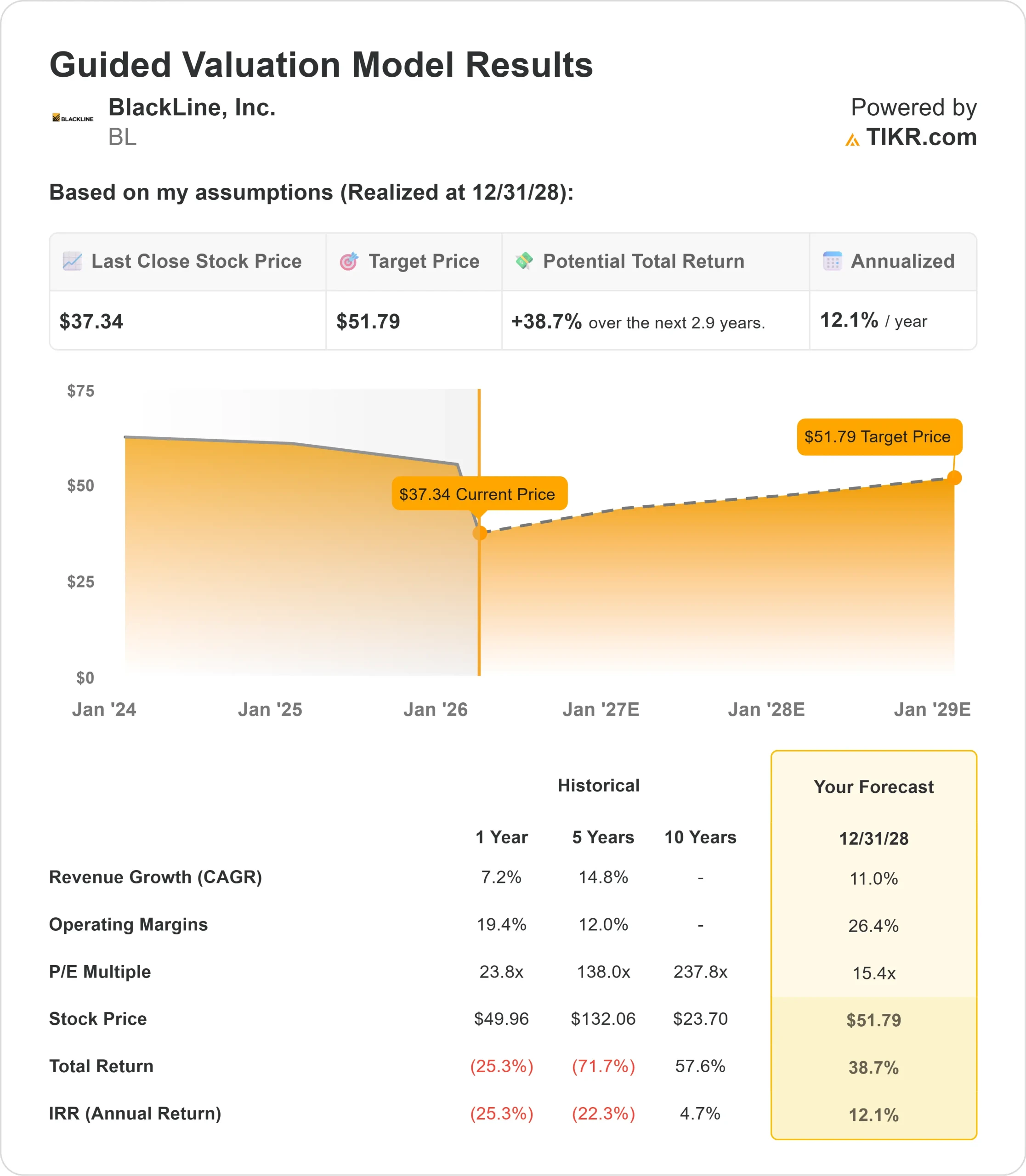 - High Case: If AI adoption accelerates, driving 11.7% revenue growth while BlackLine maintains 26.4% margins, returns could hit 117% total (17.3% annually).
