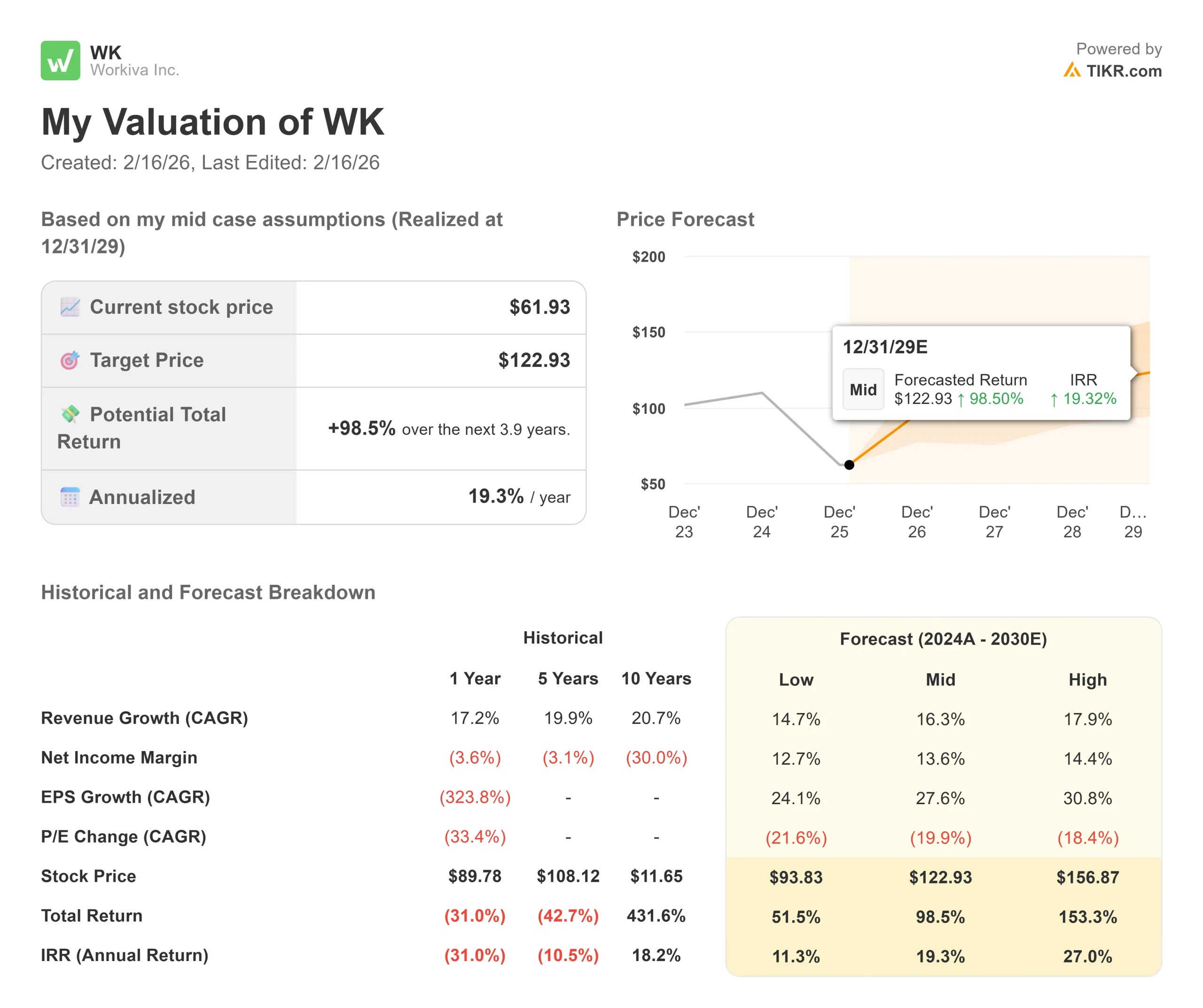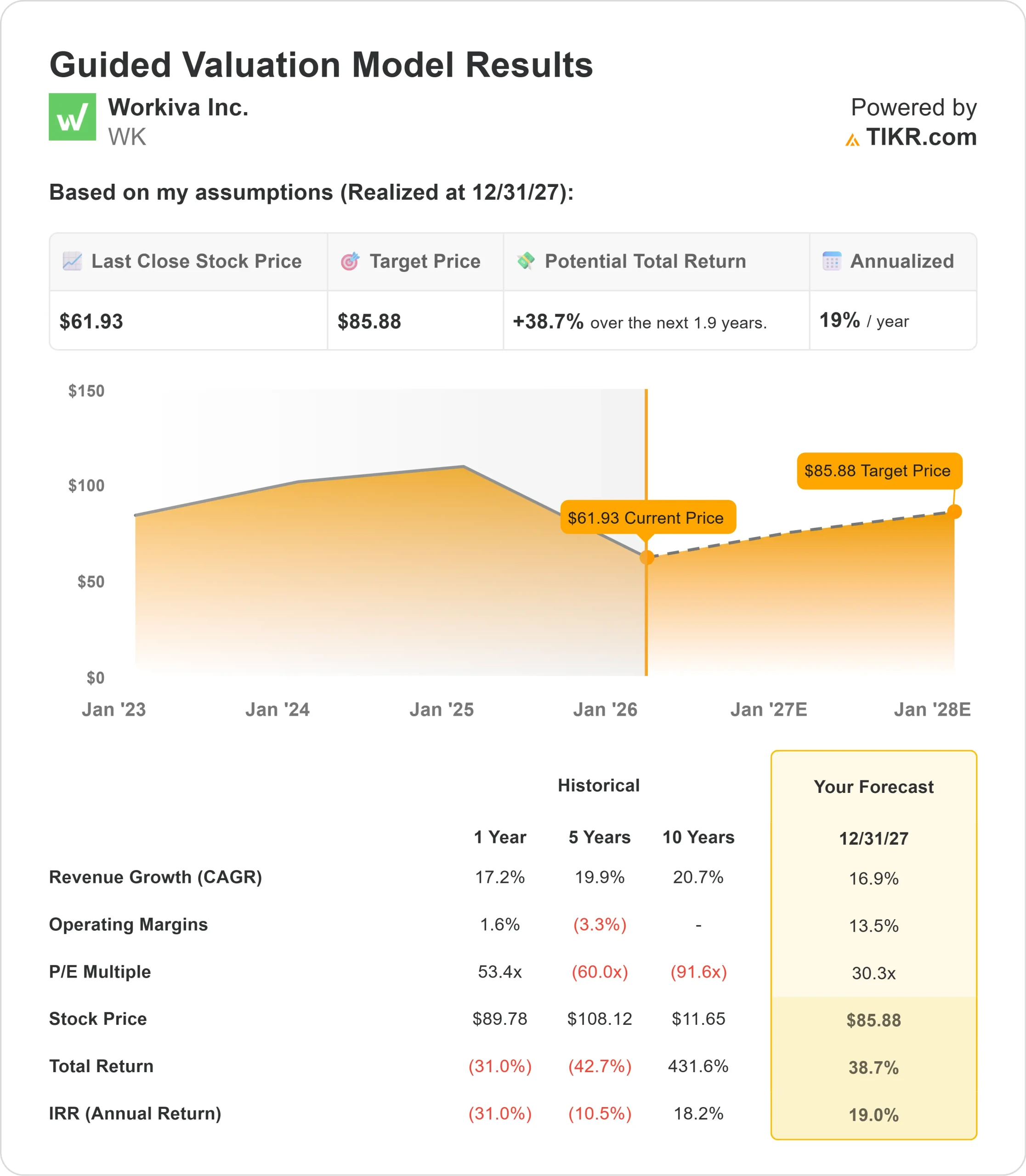 - High Case: If platform adoption accelerates, driving 17.9% revenue growth while Workiva achieves 14.4% margins, returns could hit 153% total (27% annually).