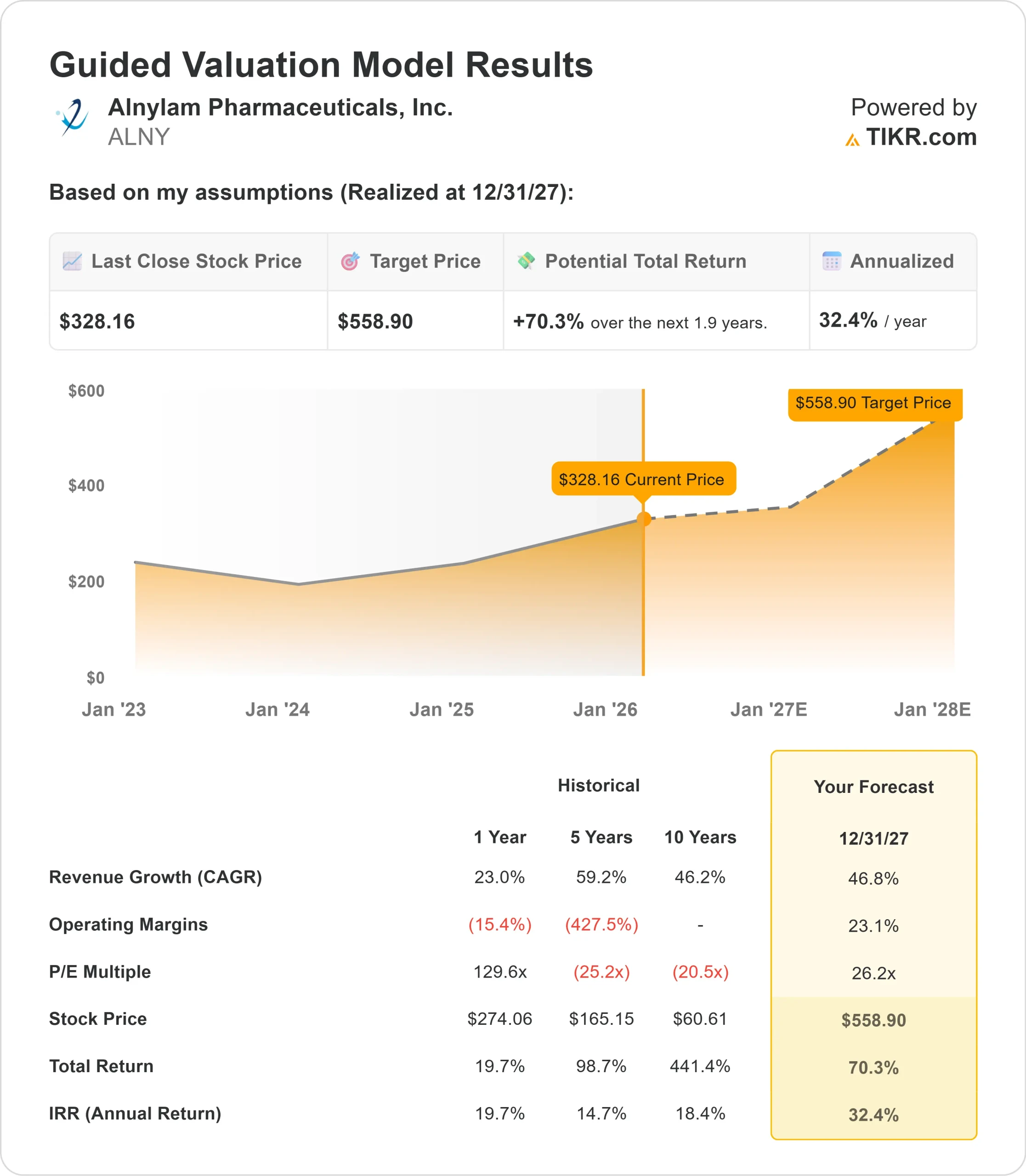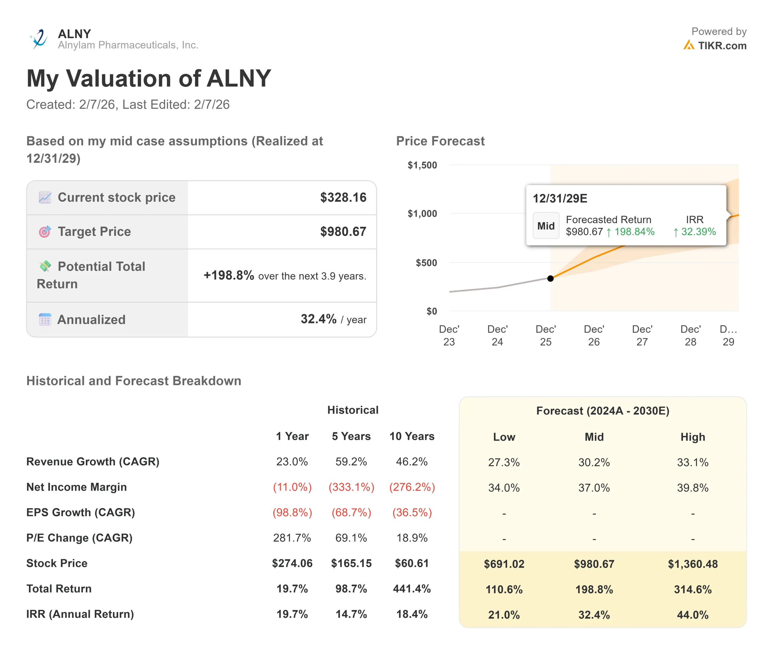 - High Case: If TTR momentum accelerates and Alnylam achieves 39.8% margins while growing at 33.1%, returns could hit 315% total (44.0% annually).