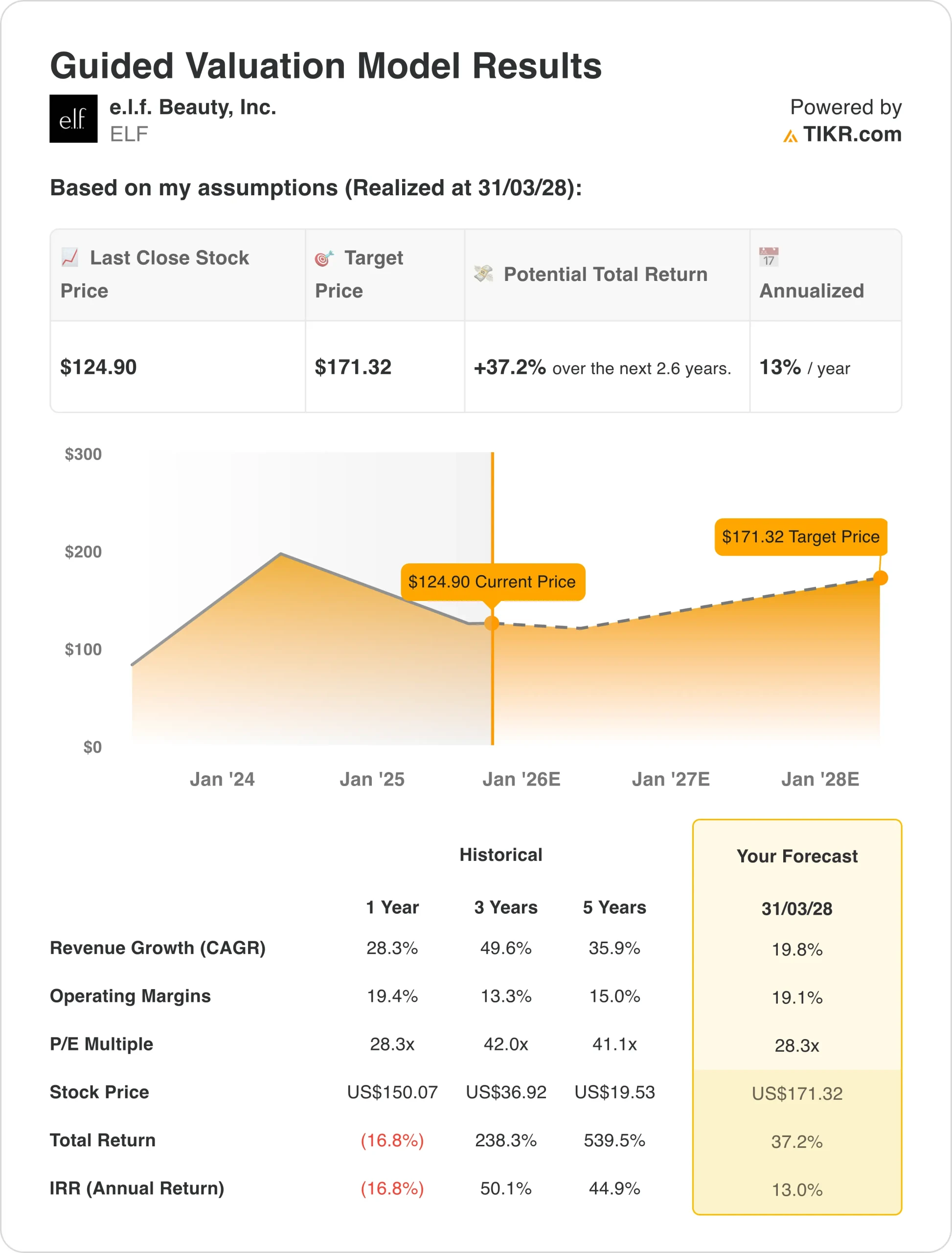 Based on estimates of 20% annual revenue growth, 19% operating margins, and a normalized P/E valuation multiple of 28x, the model projects e.l.f. Beauty stock could rise from $125/share to $171/share.
