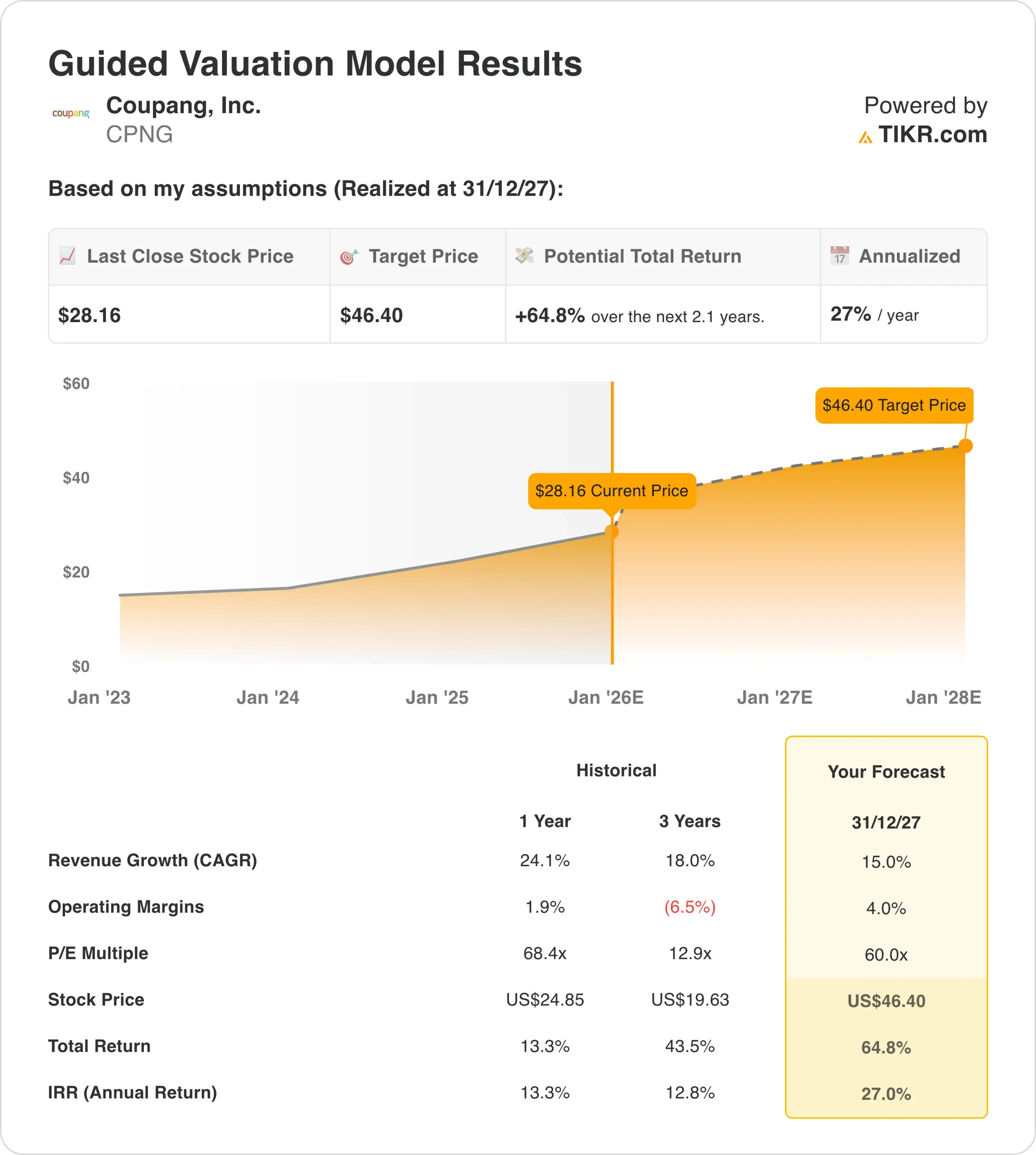 Based on estimates of 15% annual revenue growth, 4% operating margins, and a normalized P/E multiple of 60x, the model projects Coupang stock could rise from $28 to $46 per share.