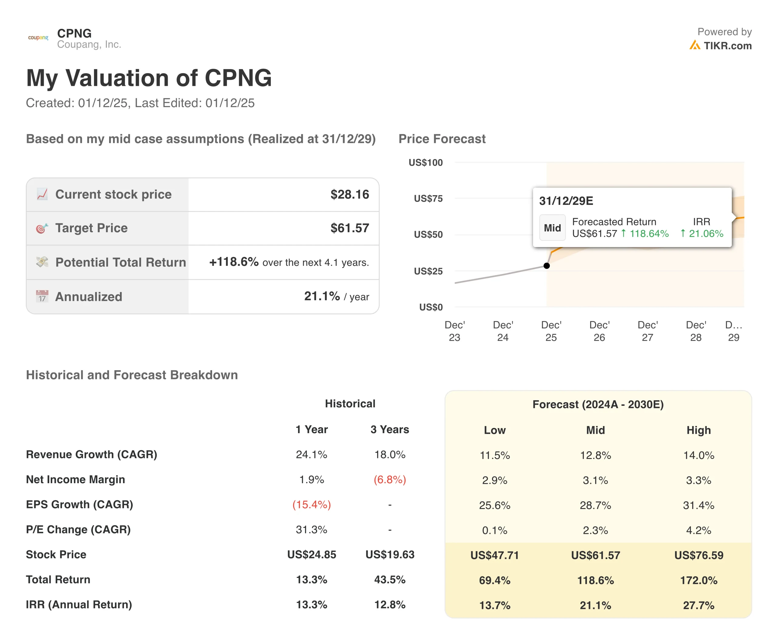 - CPNG stock could reasonably reach $46 per share by December 2027, based on our valuation assumptions.