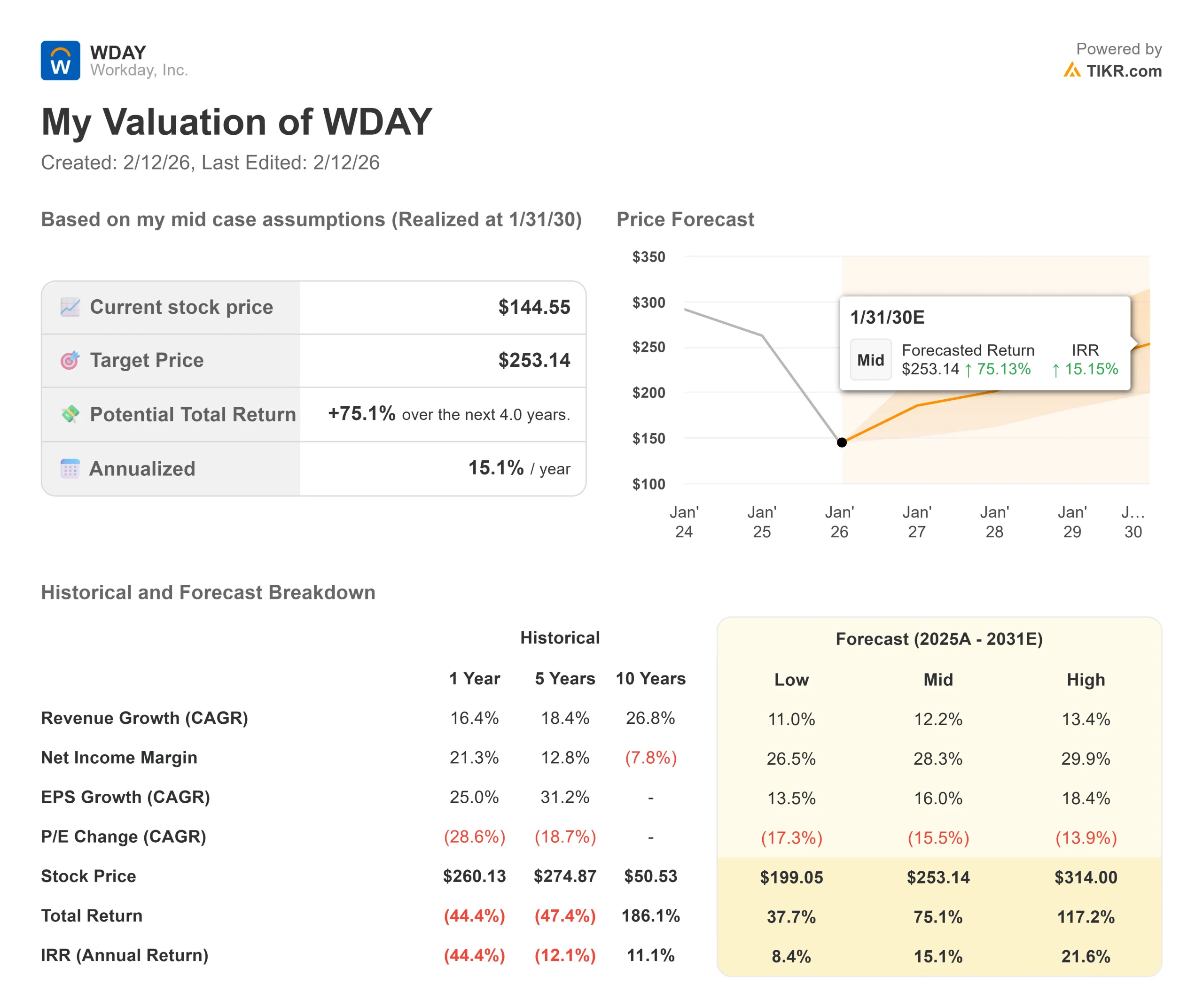 - High Case: If AI acceleration drives 13.4% revenue growth while Workday maintains 29.9% margins, returns could hit 117% total (21.6% annually).